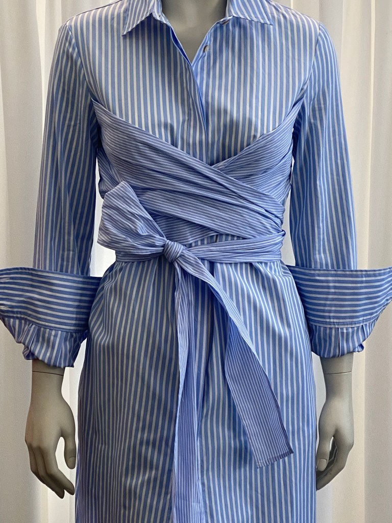 Erika Cavallini ist eine Kollektion mit besonderen Raffinessen. Im Fall dieses Kleides aus Baumwolle mit klassischen Hemdstreifen ist es die Wickeloptik, die ein schönes Dekolleté schafft und ein bisschen asiatisch anmutet – ein schöner Gegensatz 🎀