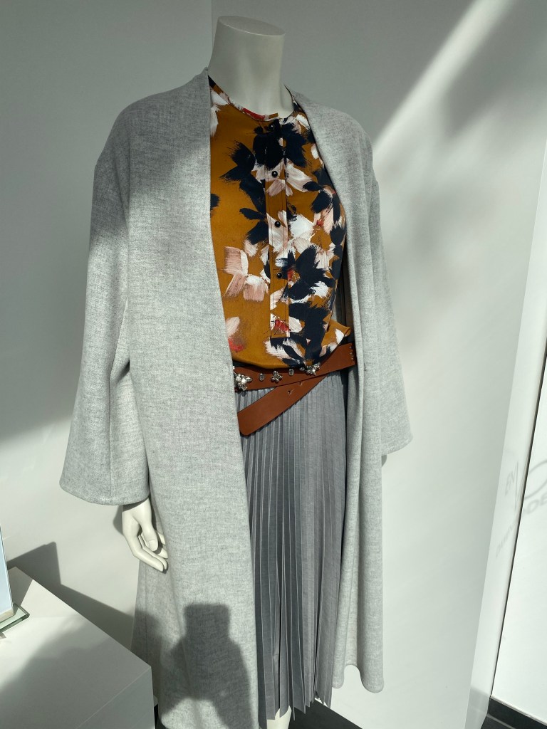 Silbergrau in Kombination mit cognac ist eine neue und spannende Farbkombination – der schöne leichte Mantel von Schumacher, kombiniert mit einer der immer wieder besonderen Druckblusen von Schumacher innovativ kombiniert mit dem Plisseerock von Fabiana Filippi – lässig und feminin 😍