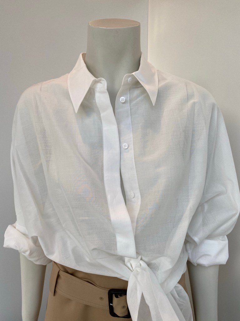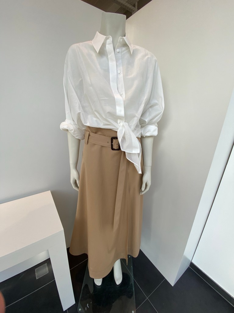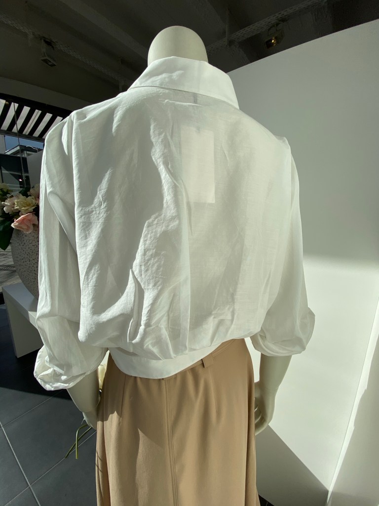 Die Bluse von Dorothee Schumacher ist ein Hauch und kann als Jäckchen getragen werden. Hinten kurz und ein bisschen Blouson vorn zum binden.