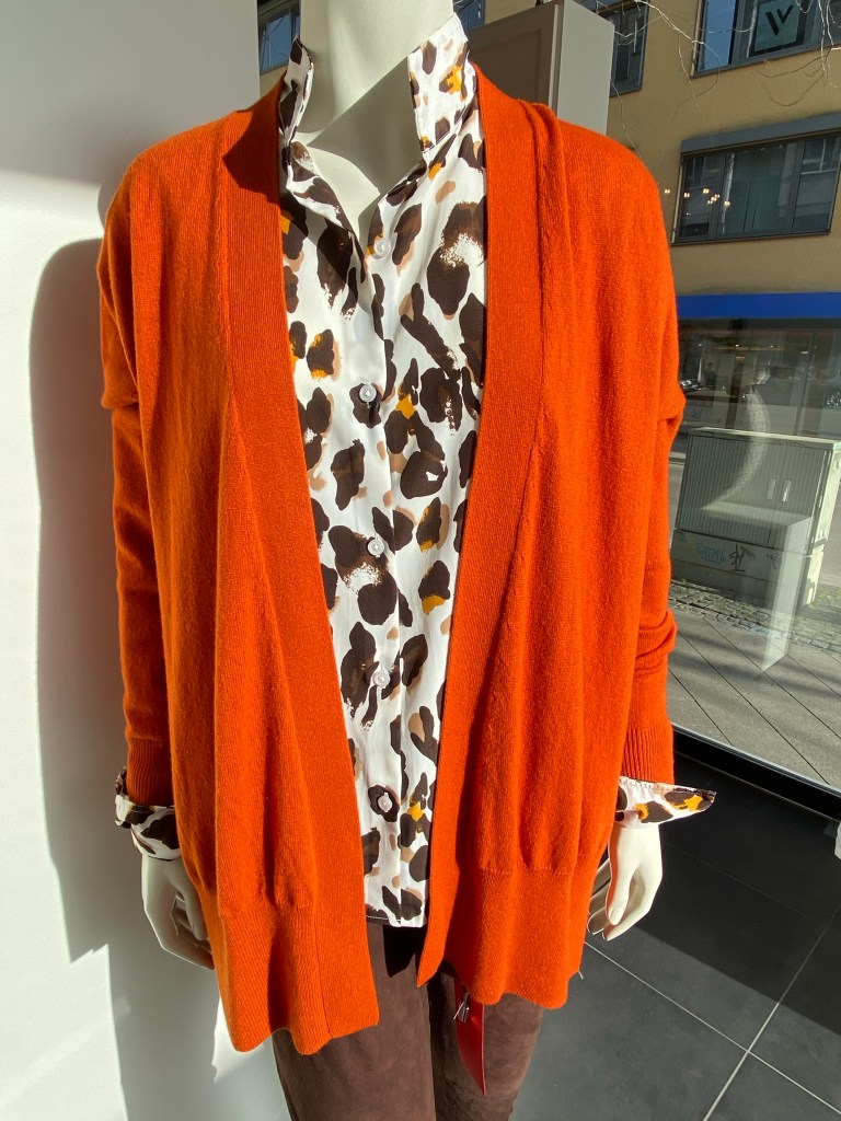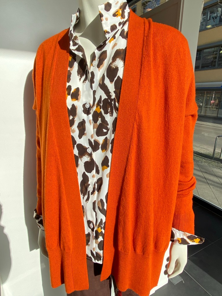 Steffen Schraut Strickjacke, mit Gürtel zum Binden, aber auch gut lässig zu tragen wie auf dem Foto. Die Farbe terracotta schafft den Spagat zwischen Frühling und Winter, mit Jeans und hellblauer Bluse nämlich richtig frisch. Sie ist aus reinem Cashmere und hat noch mal eine kleine Reduzierung bekommen, Gr 38, 40