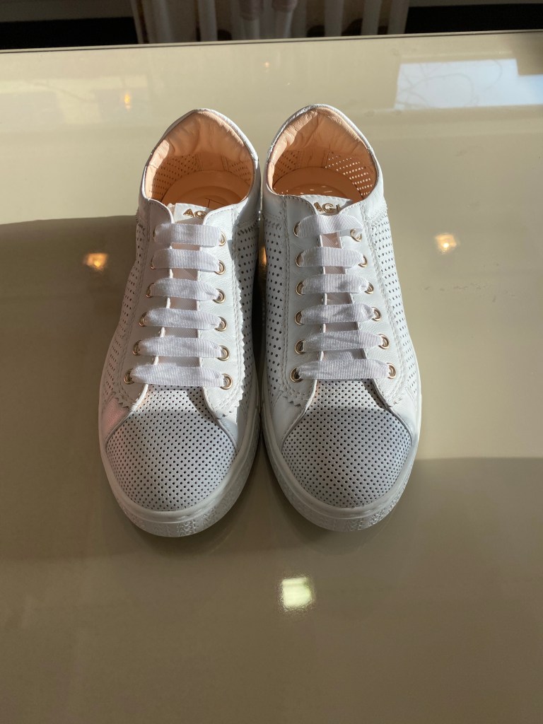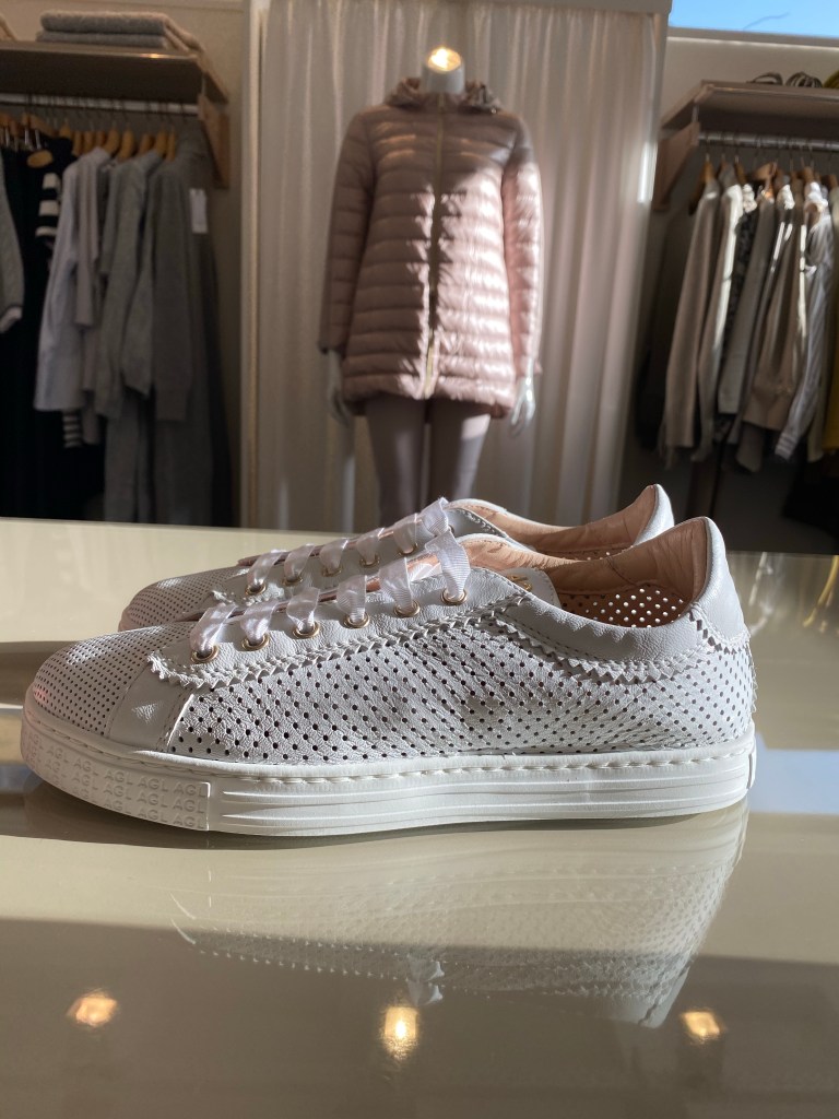 Unser Sneaker von AGL ist angelehnt an dem klassischen Sneaker, den es jede Saison gibt, aber leichter umgesetzt, die Sohle dünner, aber nicht weniger komfortabel, ungefüttert und perforiert, aber die Ferse trotzdem weich gepolstert. Weiß passt zu allen Farben.