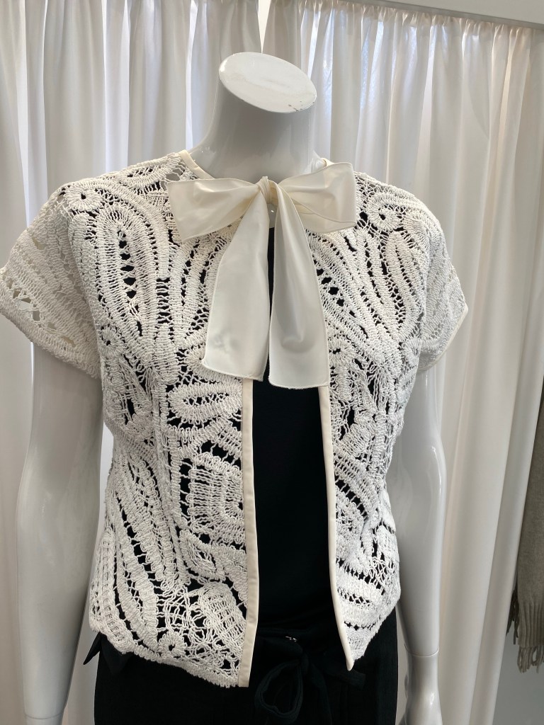 Ein besonderes Stück ist das Oberteil aus Baumwoll-Spitze, so schön, dass wir tatsächlich drei Farben eingekauft haben! Das kommt sehr selten vor. Zu weiß haben wir noch beige und schwarz. Das Oberteil ist auch von Uli Schneider und es kann mit Öffnung vorn oder hinten getragen werden, also Shirt oder Jäckchen