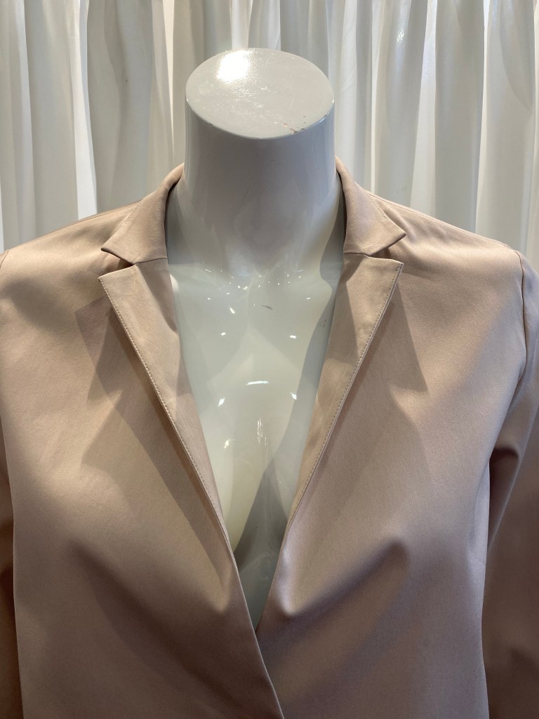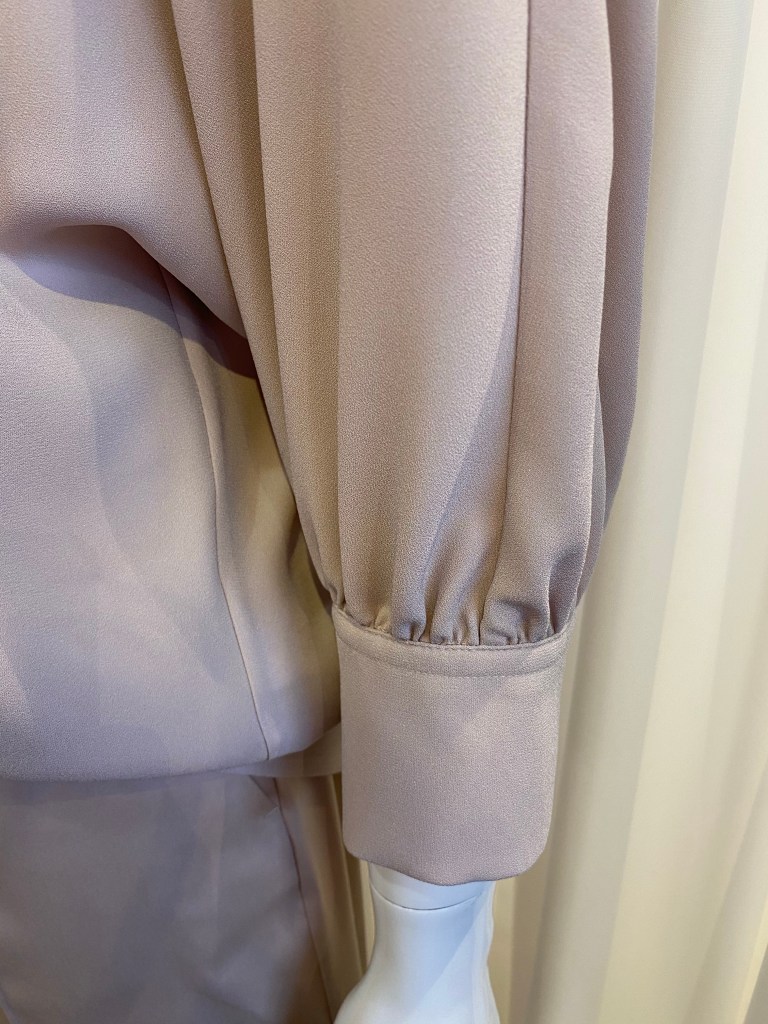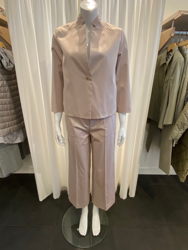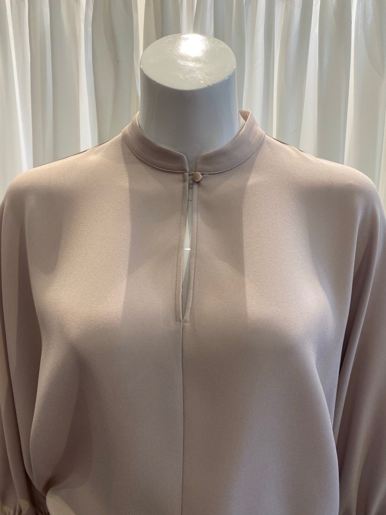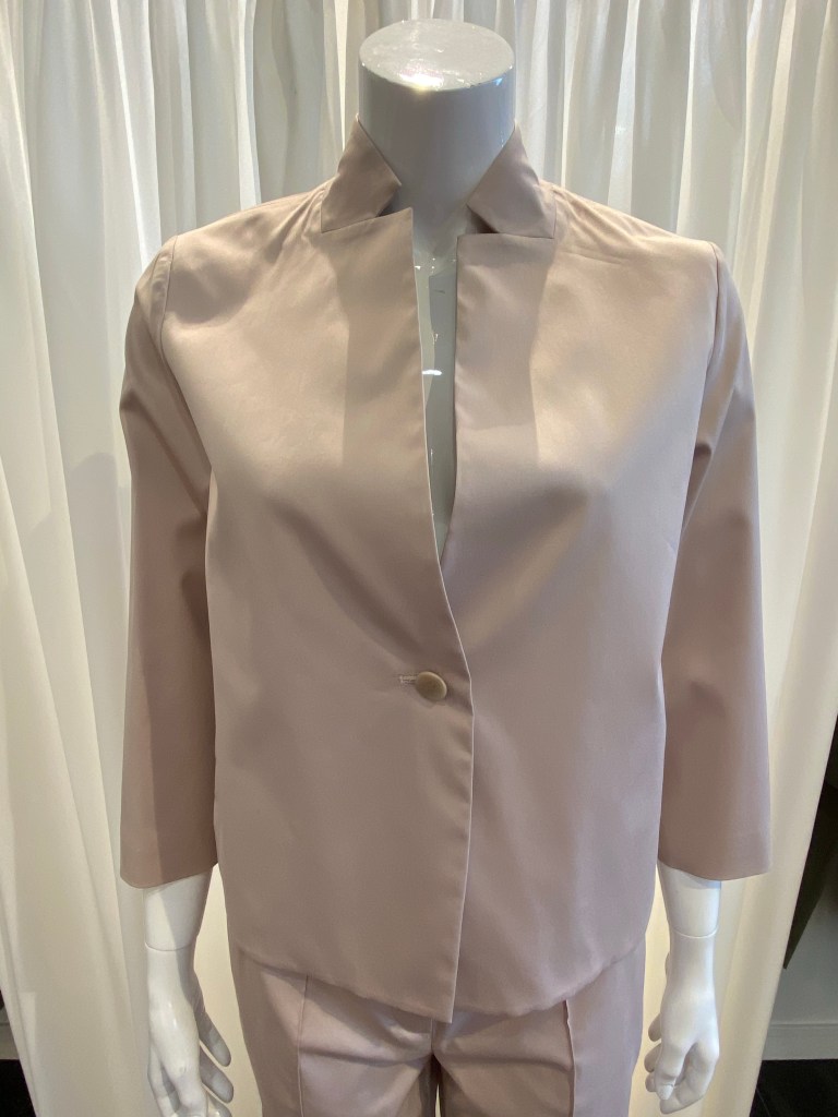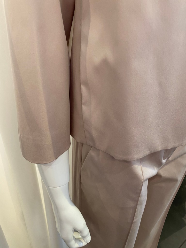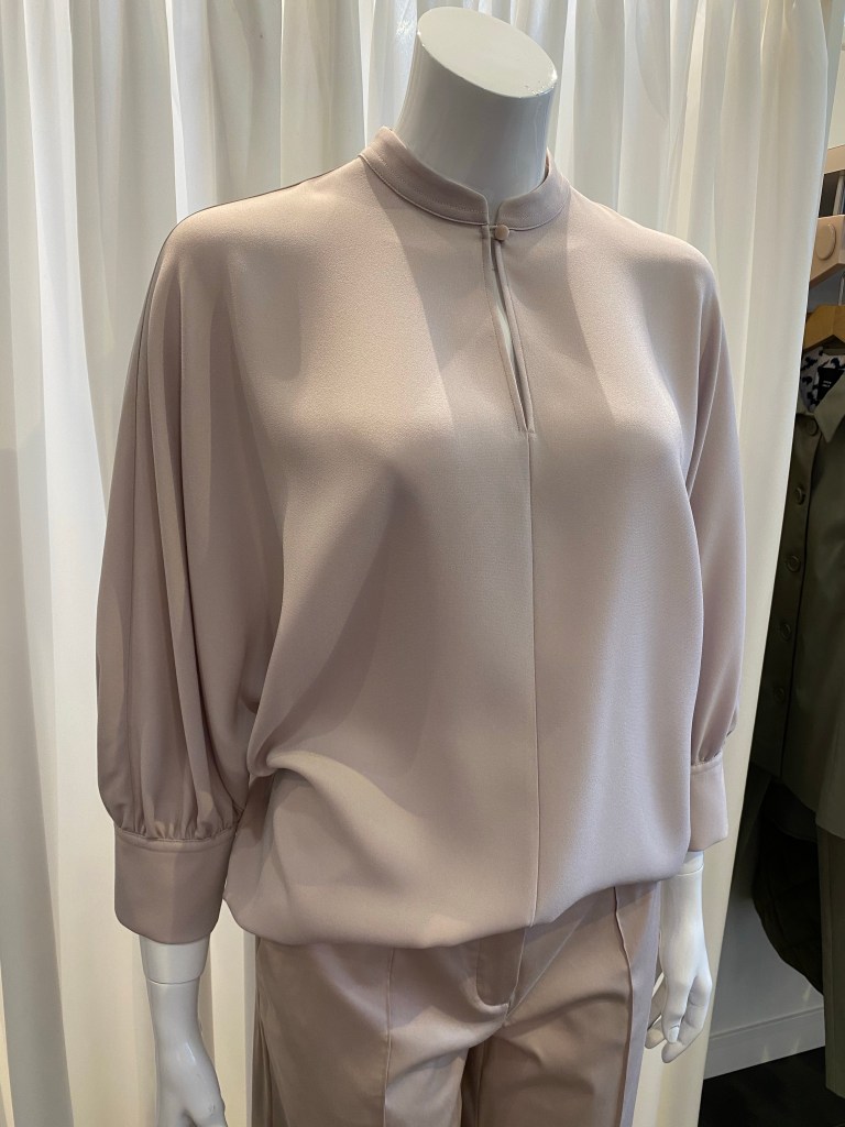 Eine Qualität aus Triacetat, die es bei Windsor seit Jahren gibt und gerade bei Blusen und Kleidern oft zum Einsatz kommt, weil sie einen „schweren“ Fall hat und unkompliziert in der Pflege ist, begeistert uns auch immer wieder. Diese Bluse hat einen 3/4 langen Fledermaus-Arm und hat den gleichen Farbton wie Hose und Jacke.