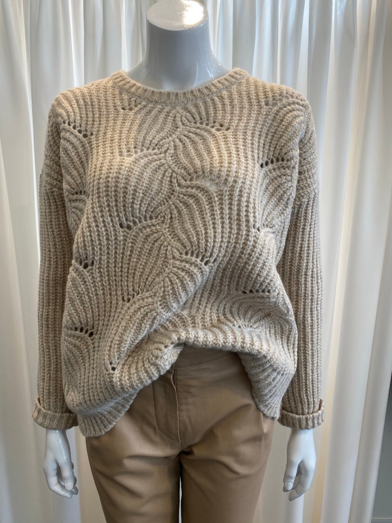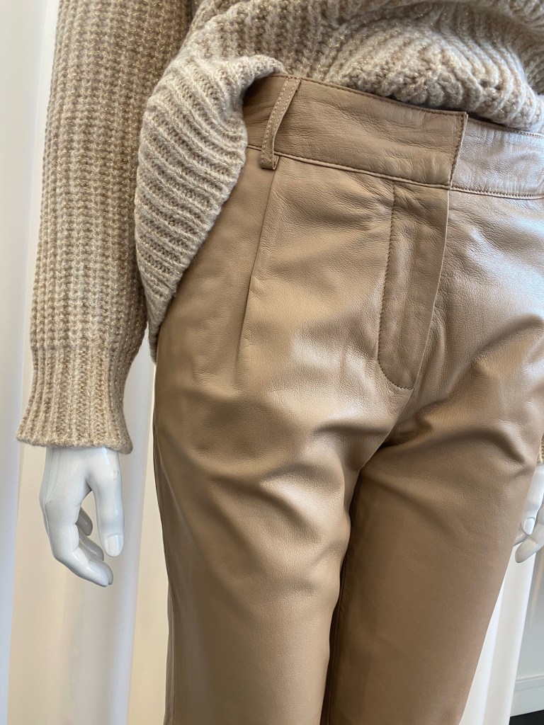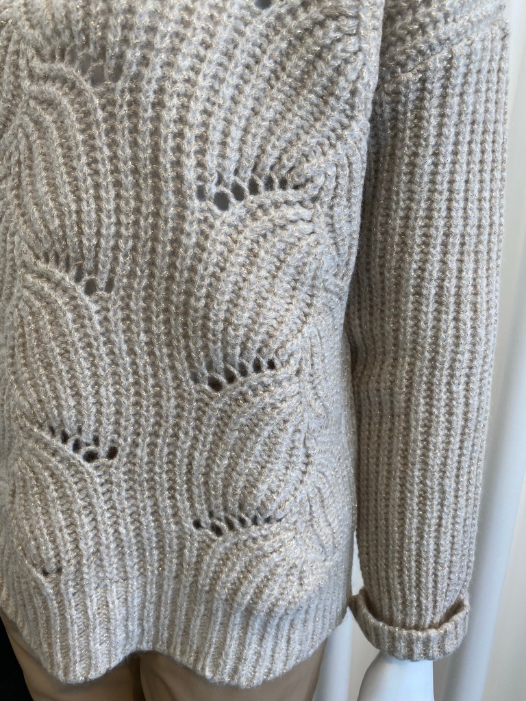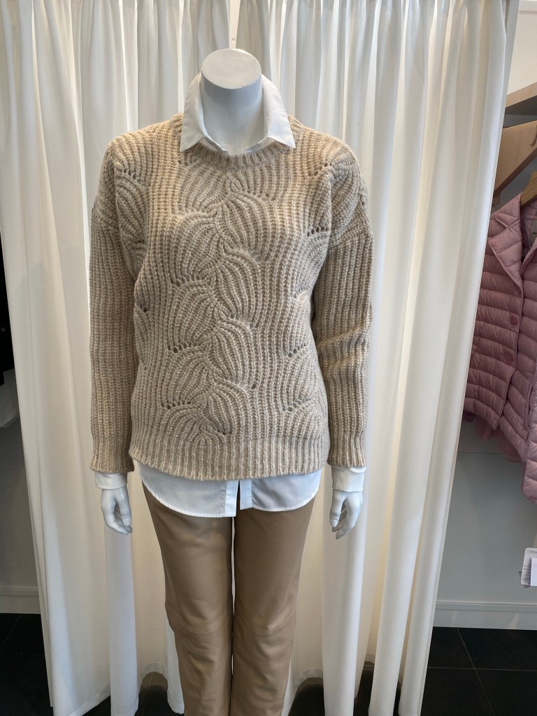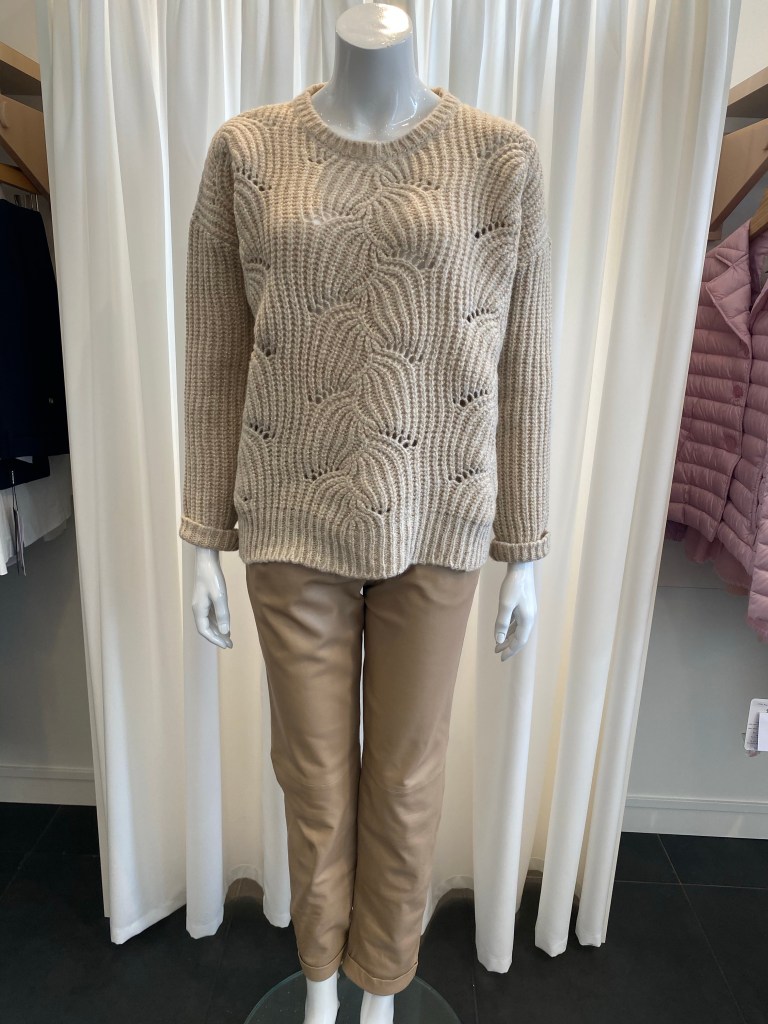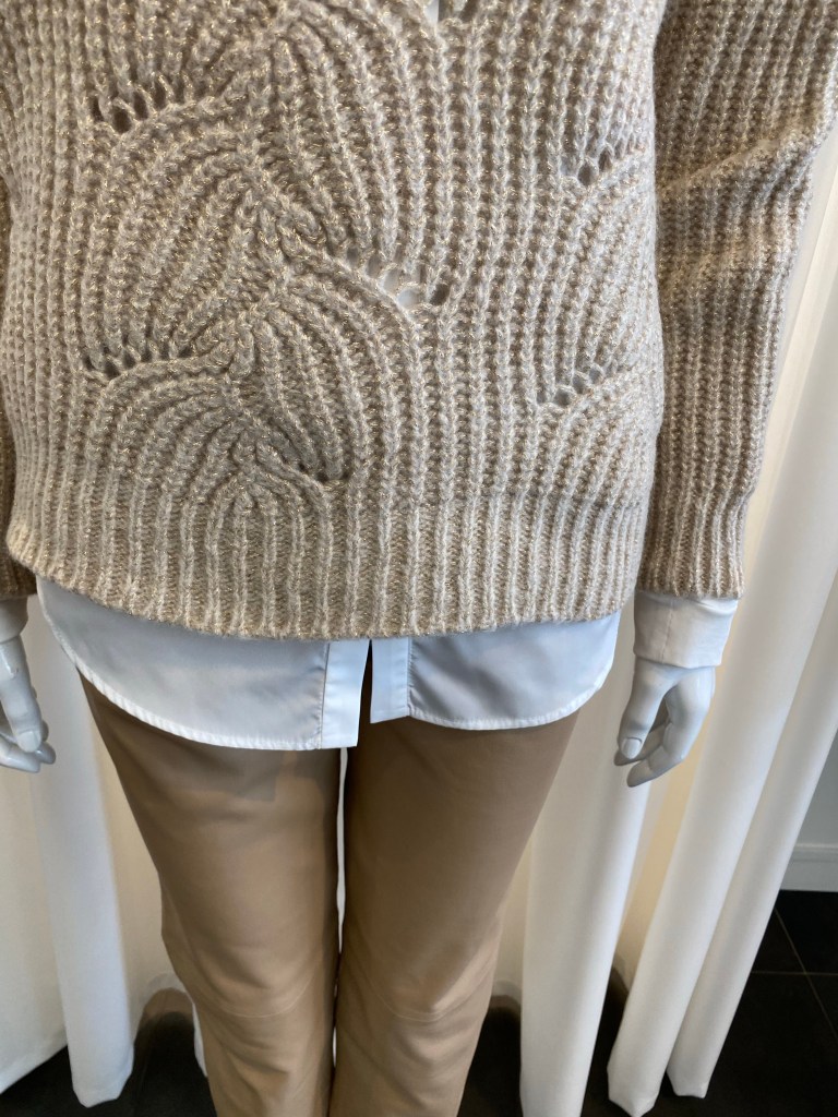 Der Pullover ist Wolle/Metall/Poyamid. Metall steht für den zarten Lurexfaden in Gold, der den Pullover durchwirkt und ihm einen warmen Glanz gibt. Das Muster erfordert eine zurückhaltendes Unterteil, wir haben uns für eine Lederhose entschieden