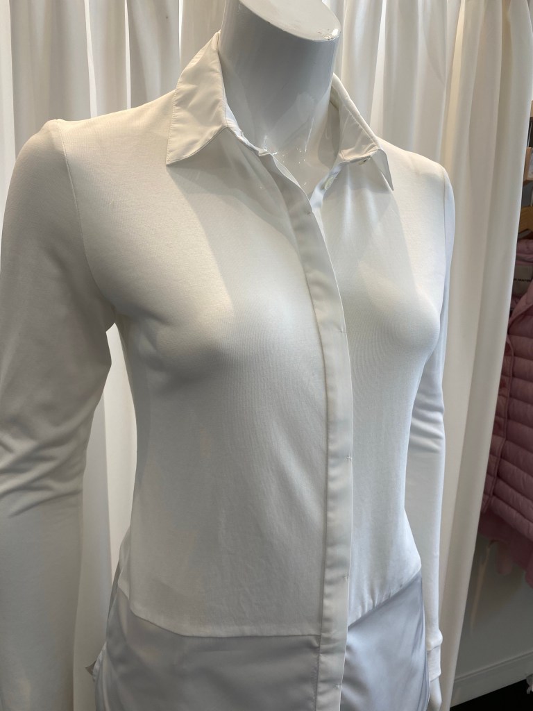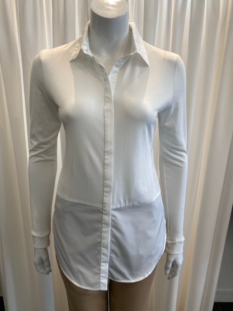 Uli Schneider hat eine Bluse entworfen, die optimal zum „Drunter-Tragen“ ist. Der Körper und der Arm sind aus Jersey und die aus dem Pullover hervorragenden Teile sind aus Taft. Oft sind Baumwoll-Blusen zu steif, um sie unter einen Pullover oder Blazer zutragen, mit dieser funktioniert das super