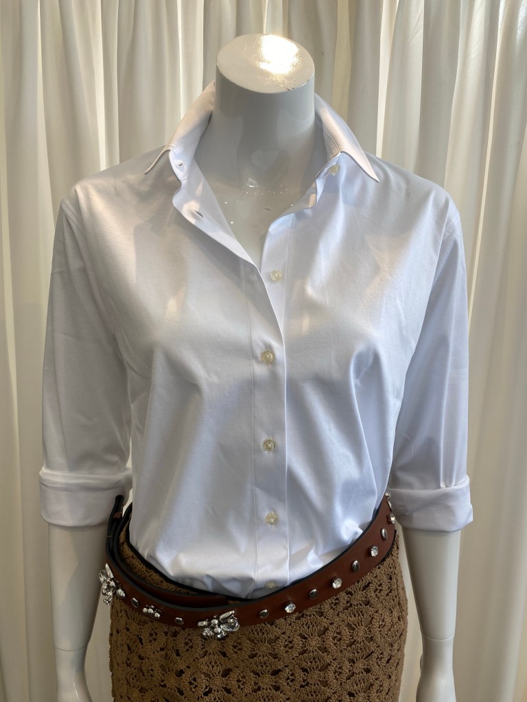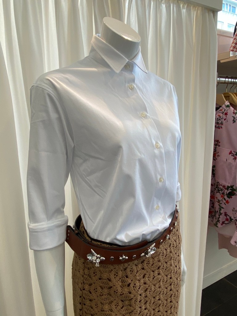 Kleiner Kragen, kleine Knöpfe, Rückenfalte für Beweglichkeit und Bequemlichkeit. Jersey ist das Material der Wahl! Reine Baumwolle und super angenehm auf der Haut. Die Bluse trägt sich wie ein T-Shirt. Der Arm hat selbstverständlich einen klassischen Abschluss mit Manschette, aber gerade dieses Material sieht gekrempelt lässig aus. Diese Bluse ist direkt auf unserer Wunschliste gelandet