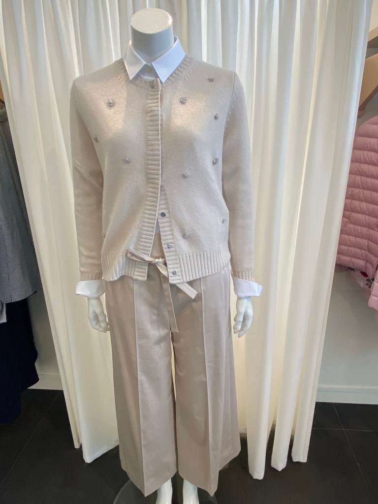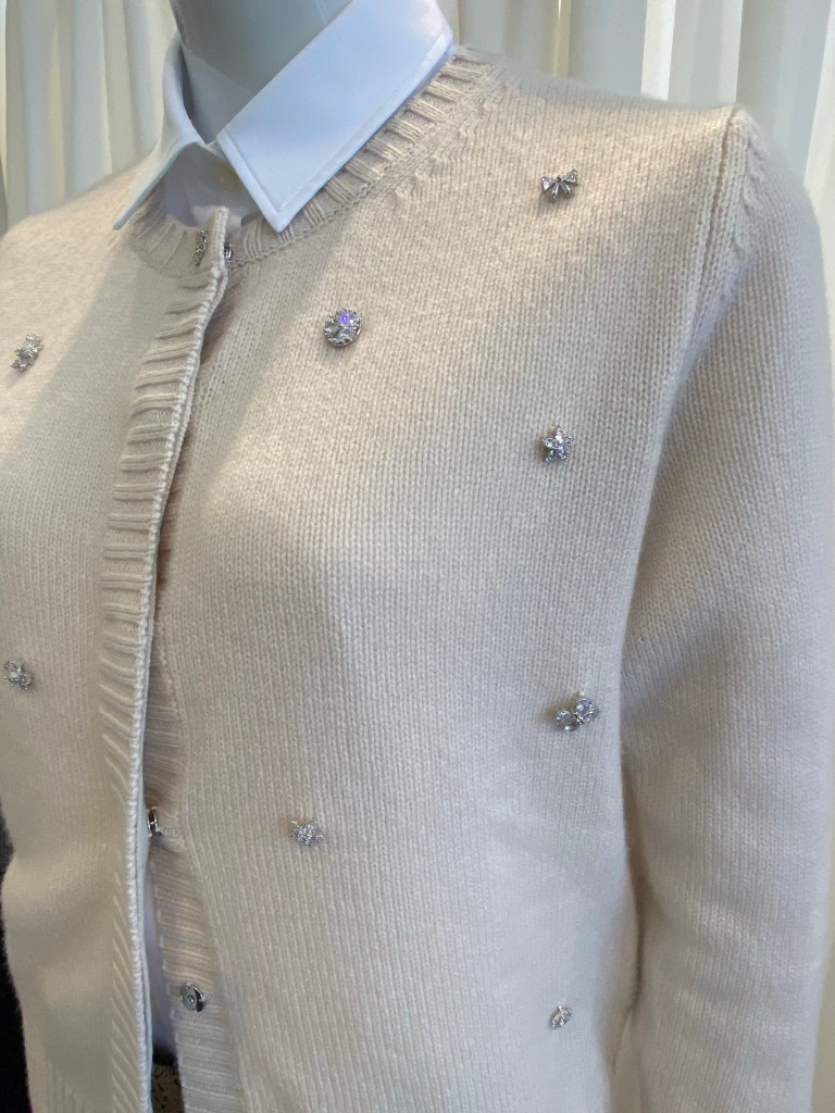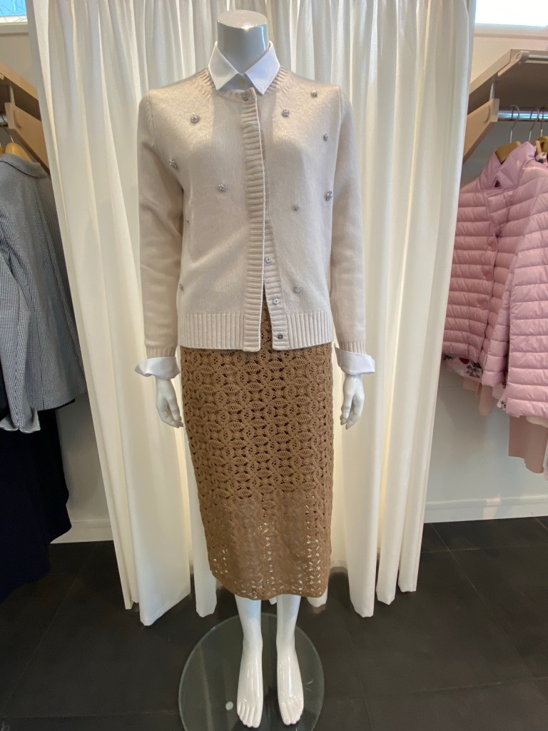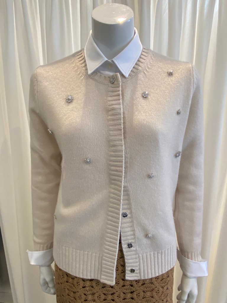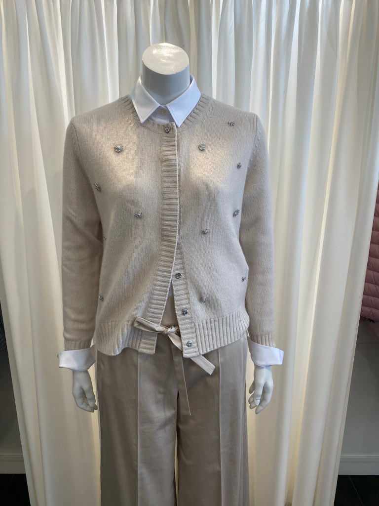 … und gut aussehen, haben wir diese kleine Strickjacke von Allude kombiniert. Klassischer Schnitt, verdeckte Druckknöpfe und kleine Strass-Elemente. Der Farbton ist nicht einfach creme – ein Hauch rose beigemischt macht ihn warm und schmeichelnd.