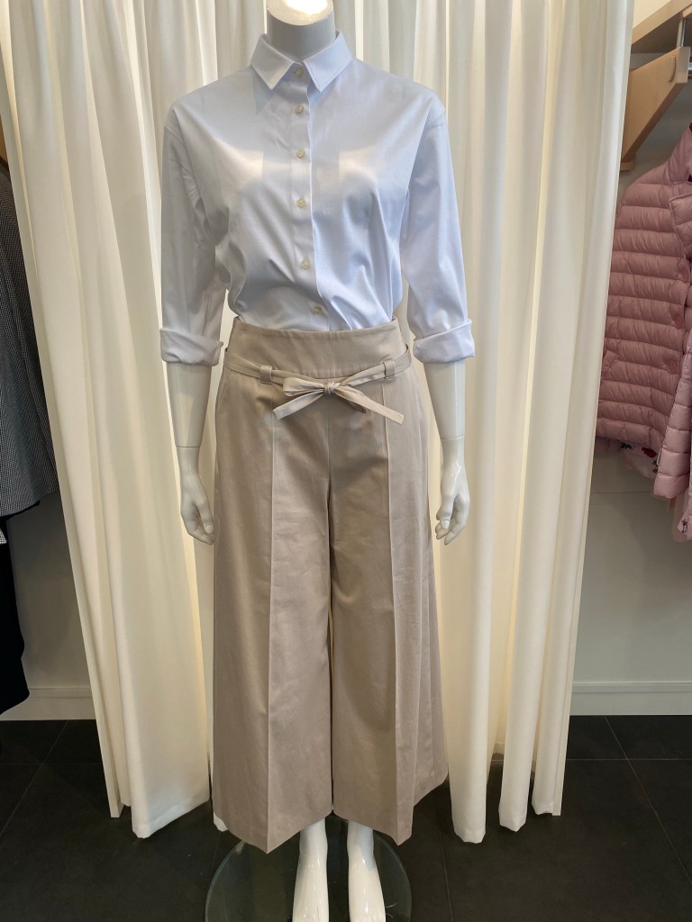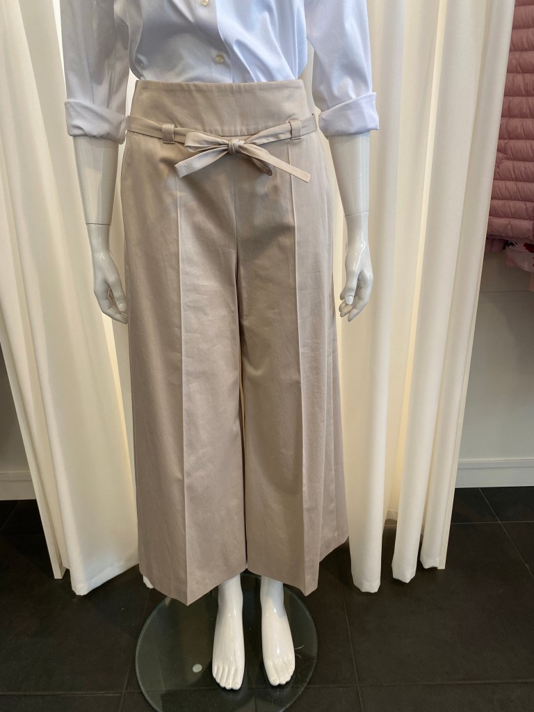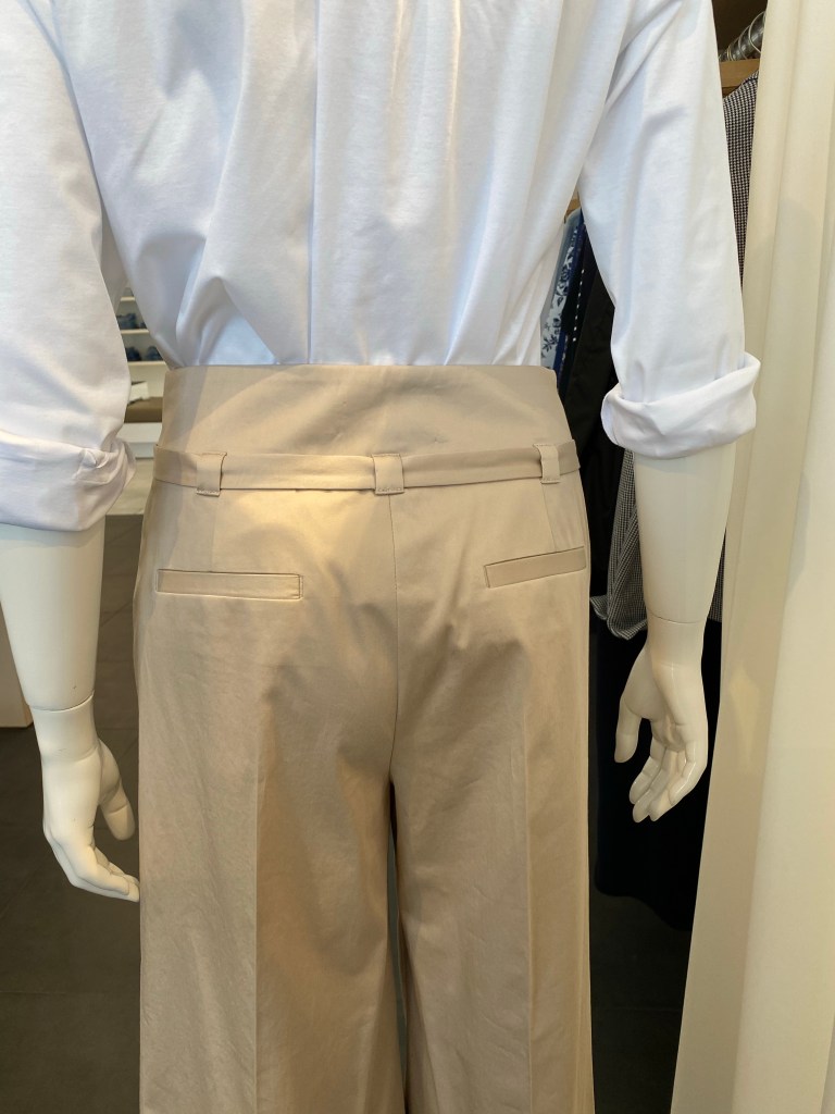 Das weite Bein ergibt fast eine Rock-Optik. Wichtig ist bei dieser Beinform immer die richtige Länge! Sie müssen auch nicht groß sein für diese Hose, denn die Weite fängt erst ab dem Oberschenkel an, oben ist sie schmal geschnitten. Mit kurzen kastigen Oberteilen oder wie hier mit einer Bluse ist es eine schöne sommerliche Hose.