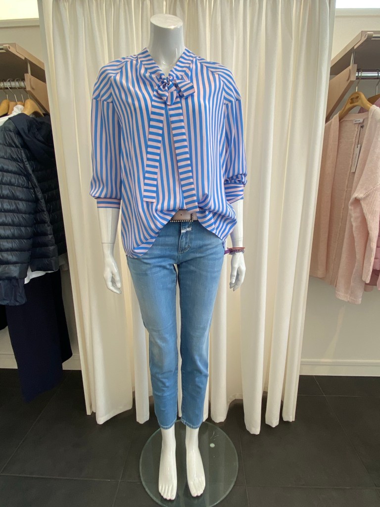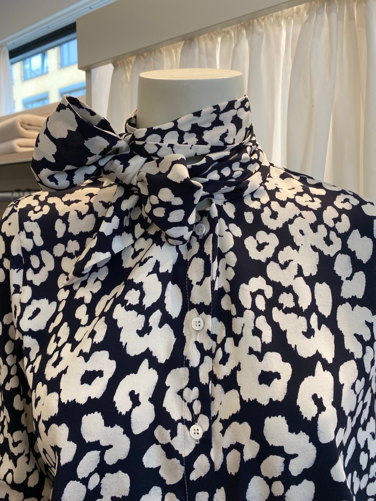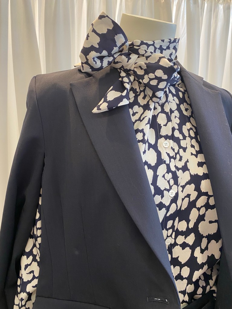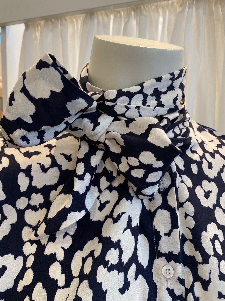 Animalprint, im besonderen Leoparden, gibt es immer wieder und in zahlreichen Varianten, aber nicht immer sieht es wertig und edel aus. Diese Bluse von Kimmich vereint beides und marine mit weiß ist eine schöne farbliche Alternative und ergänzt den blauen Anzug perfekt. Die Bluse ist aus Seide mit Elasthan und die Schleife kann auf vielfältige Art gebunden werden.