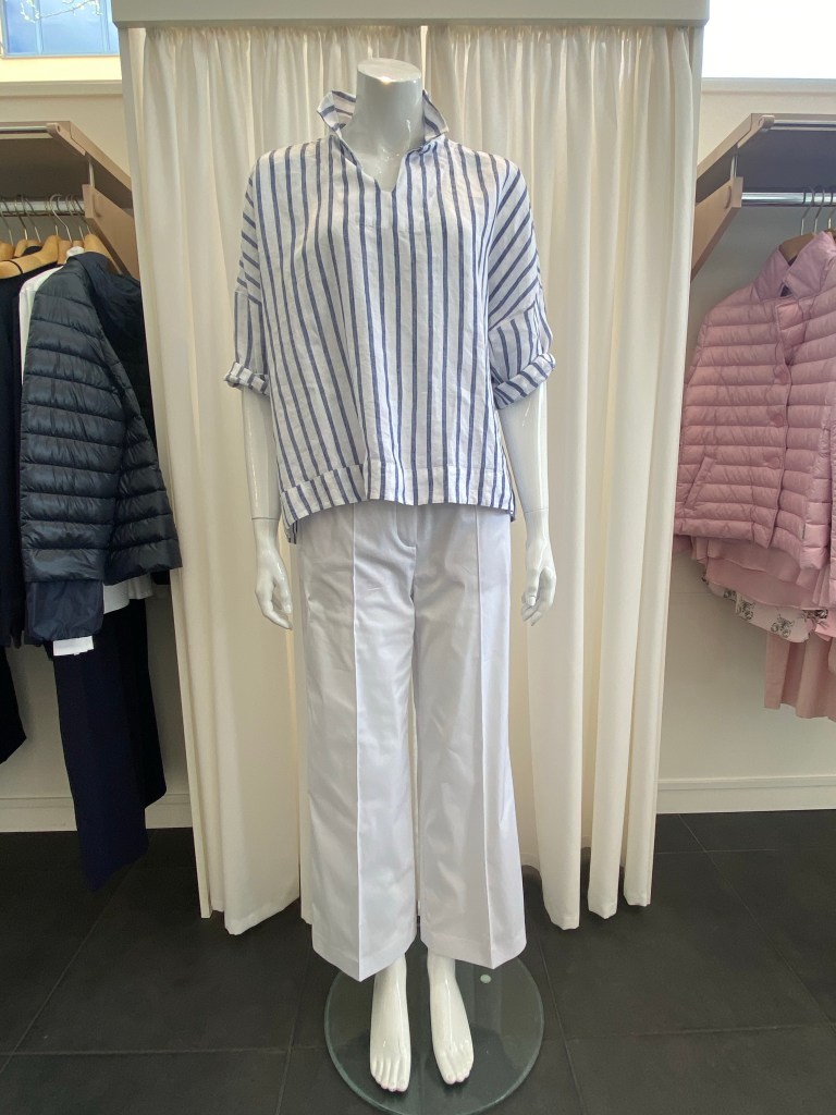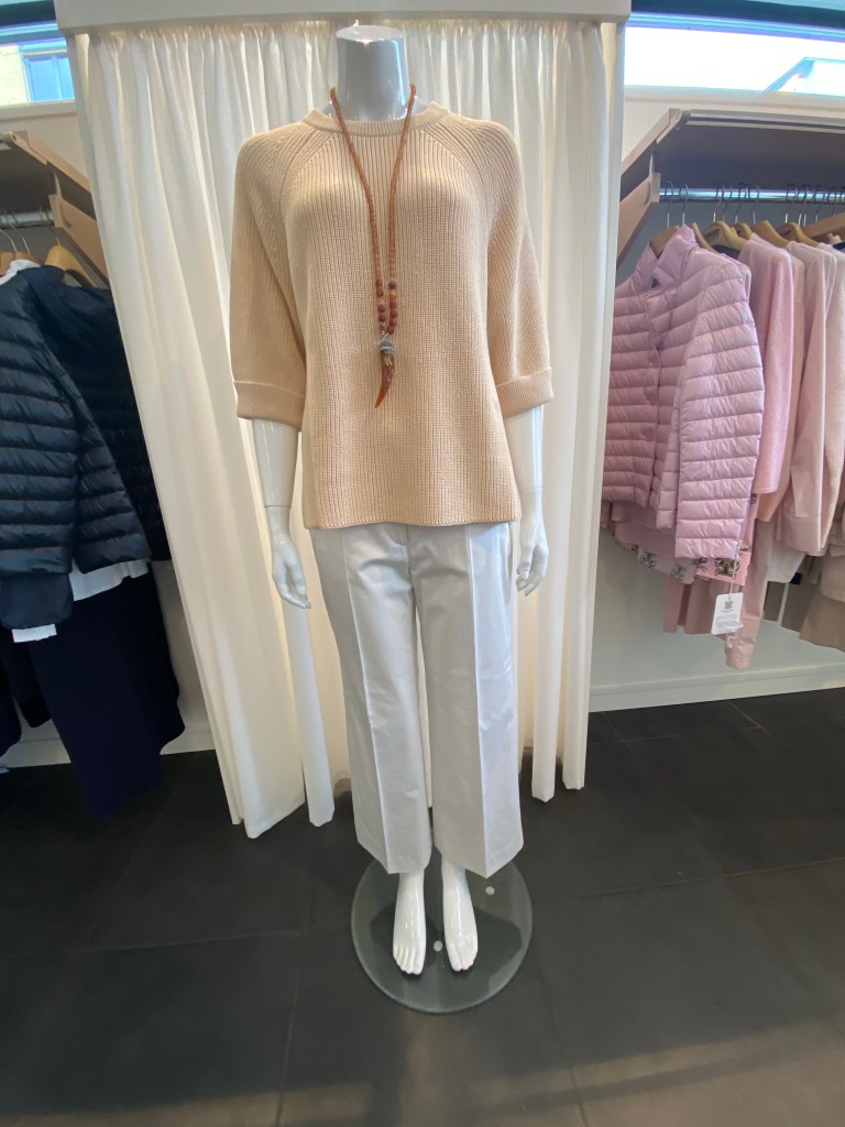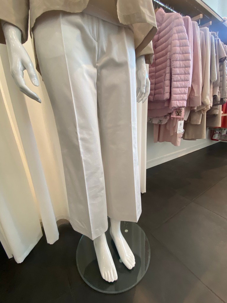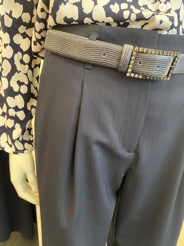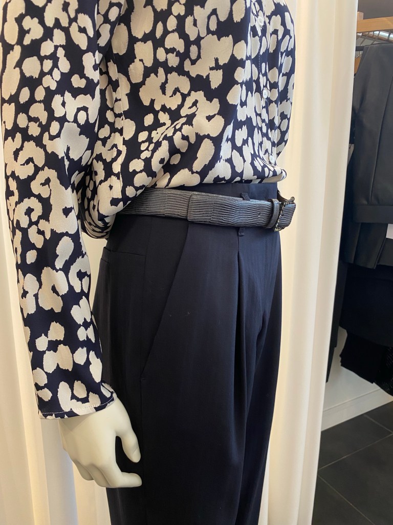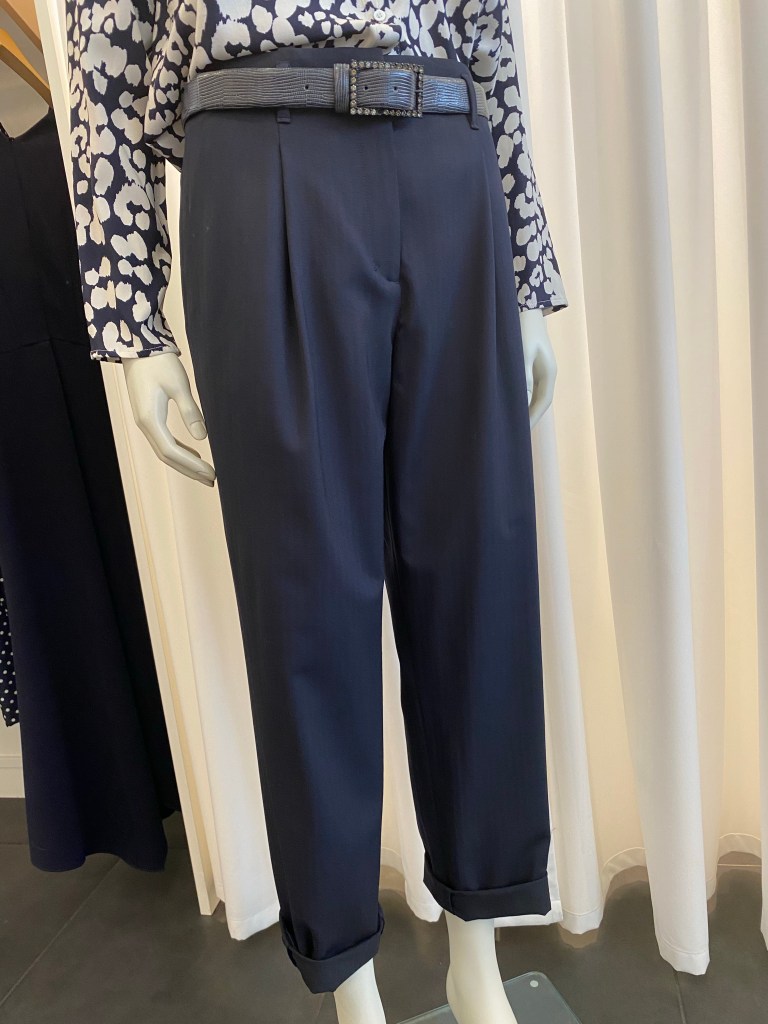 Die Hose hat einen ganz lässigen Schnitt, mit zwei Bundfalten, seitlichen Einschubtaschen und wird gekrempelt. Wir haben uns für dunkelblau entschieden, mal nicht klassisch schwarz, sondern klassisch marine 😉, aber der Schnitt ist schon extravagant genug.