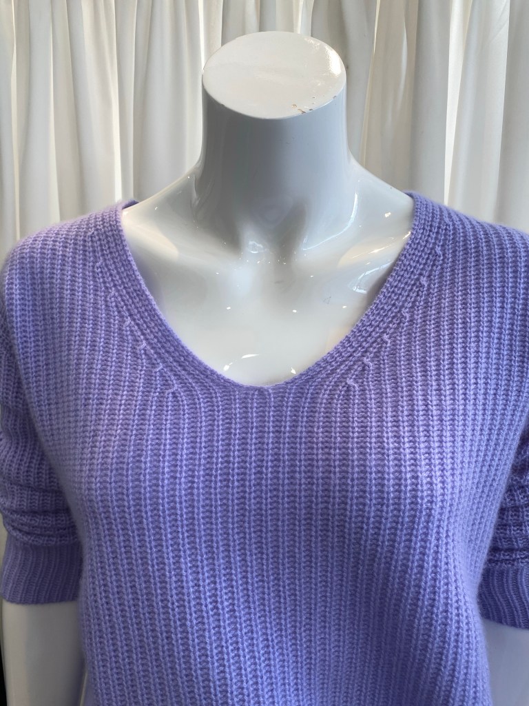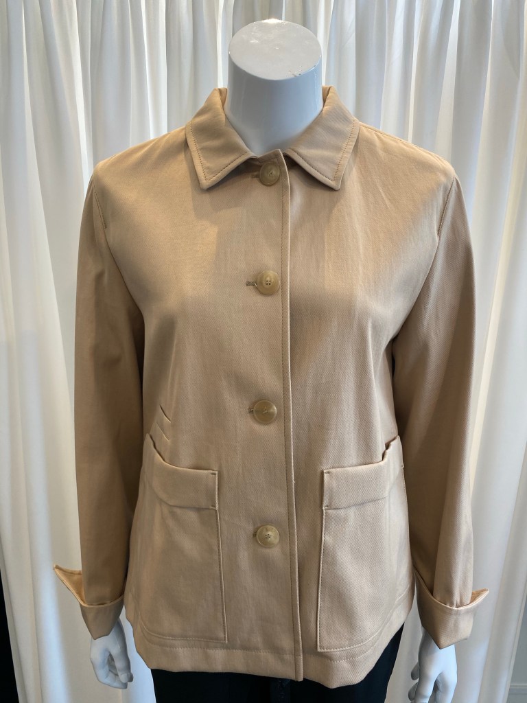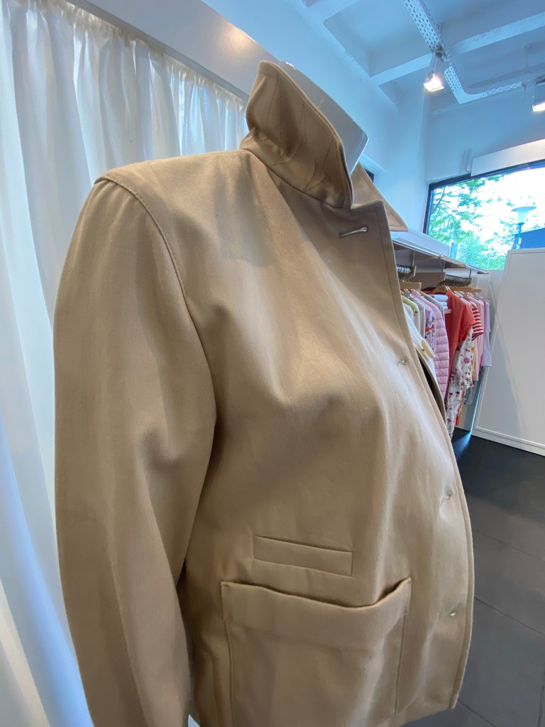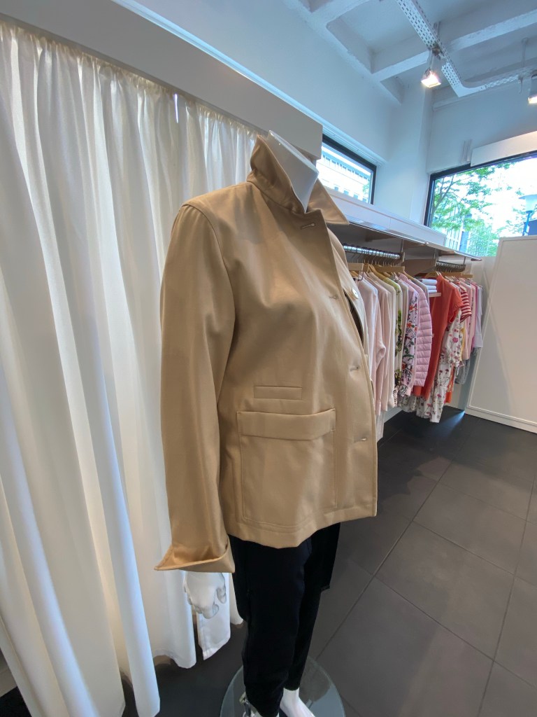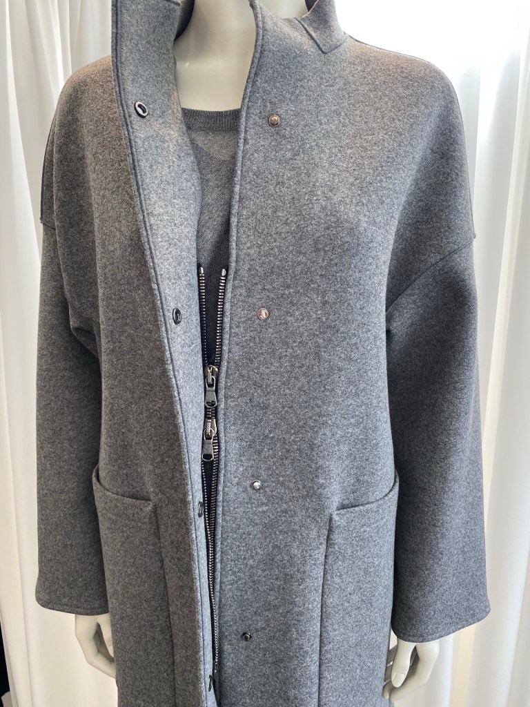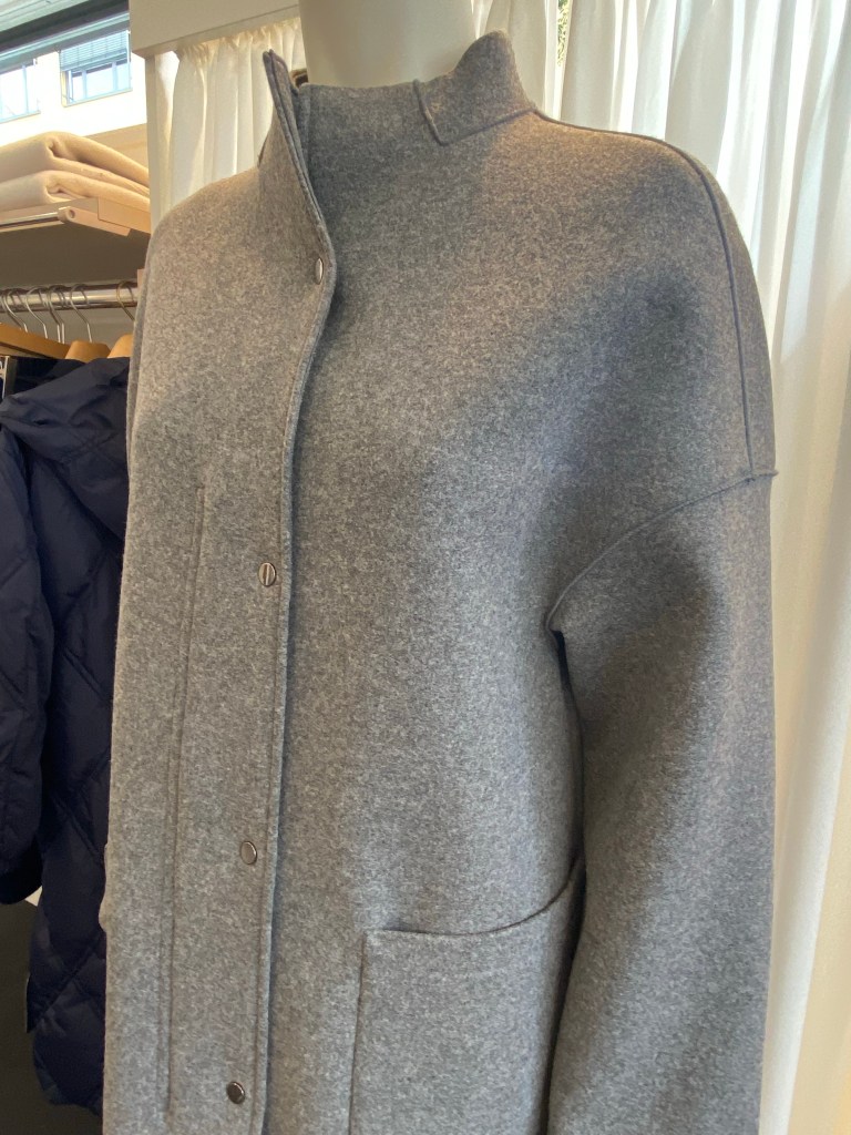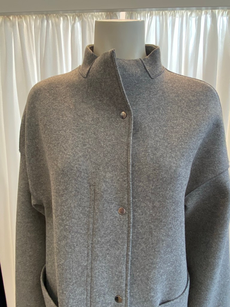 Der Blazer aus Schurwolle hat ein langes Revers und wird mit einem Knopf geschlossen, ist lässig geschnitten und hat zwei Taschen. Die Ärmel sind geschlitzt, sodass der Arm nur hinten bedeckt ist.