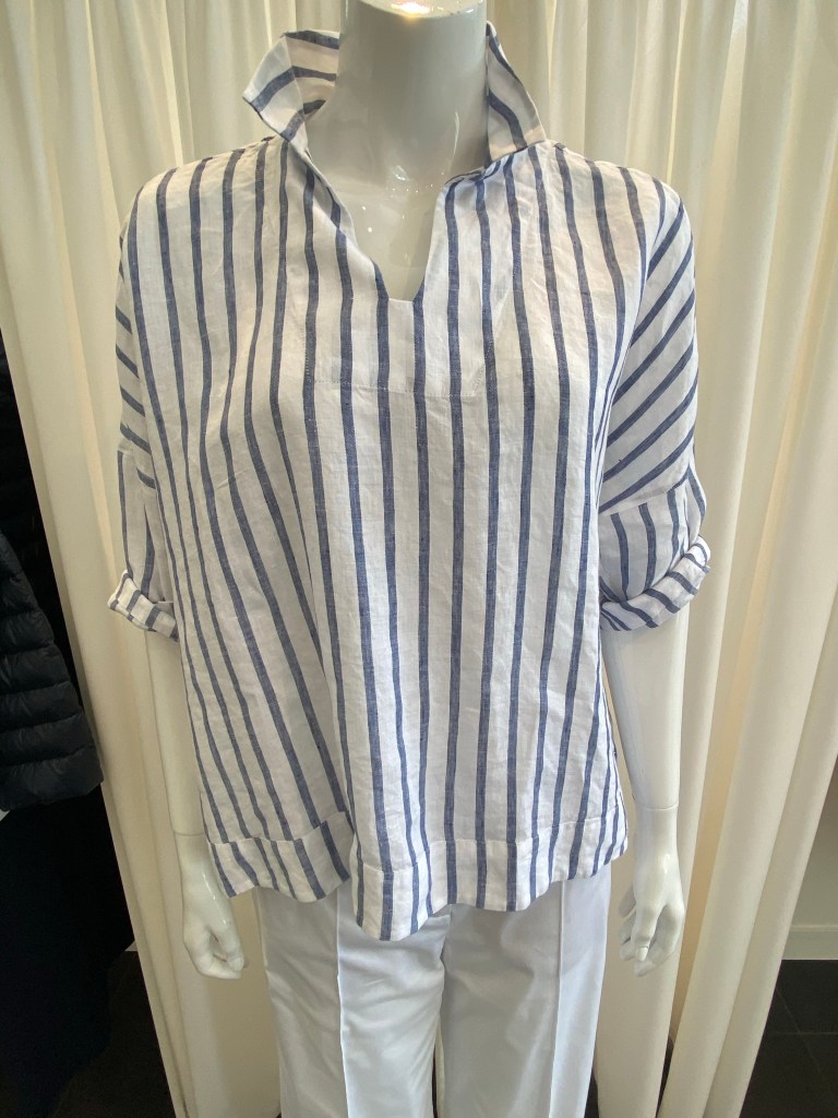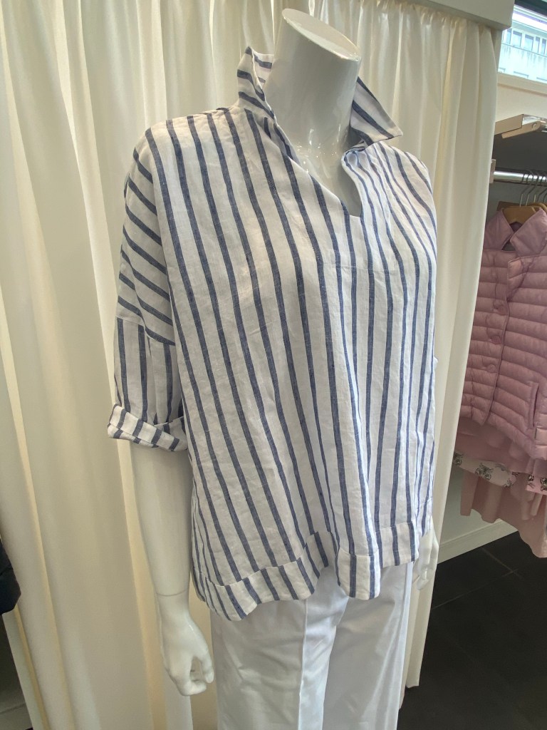 Das Hemd hat lange Schlitze an den Seiten und einen offenen Saum und kann gerade lässig oder geknotet getragen werden.