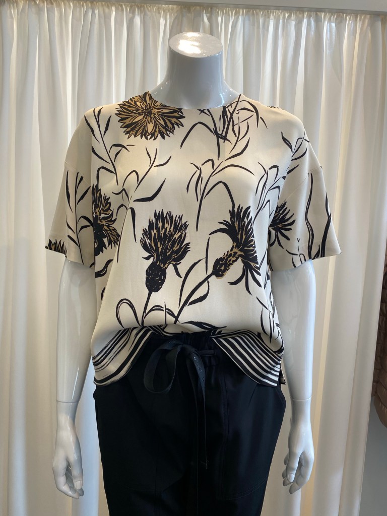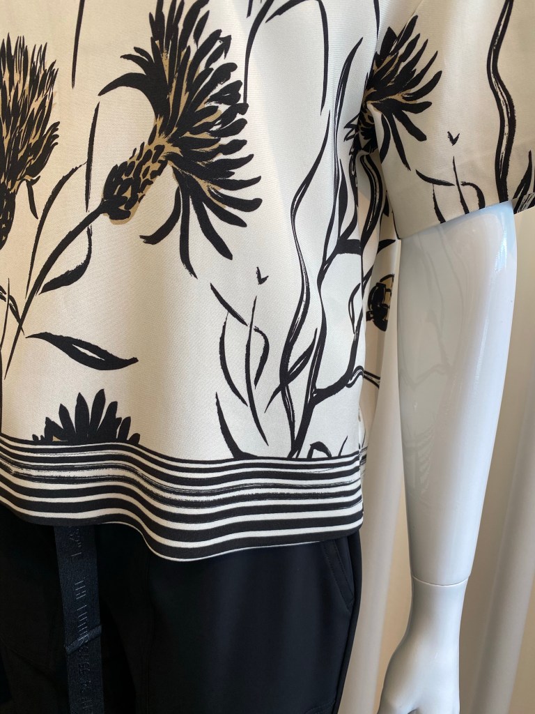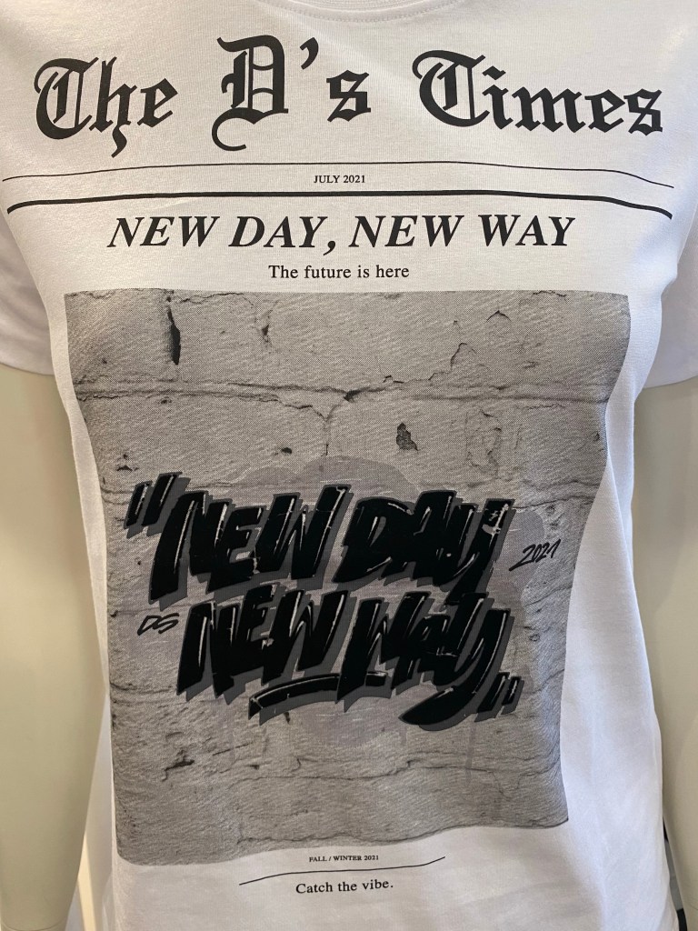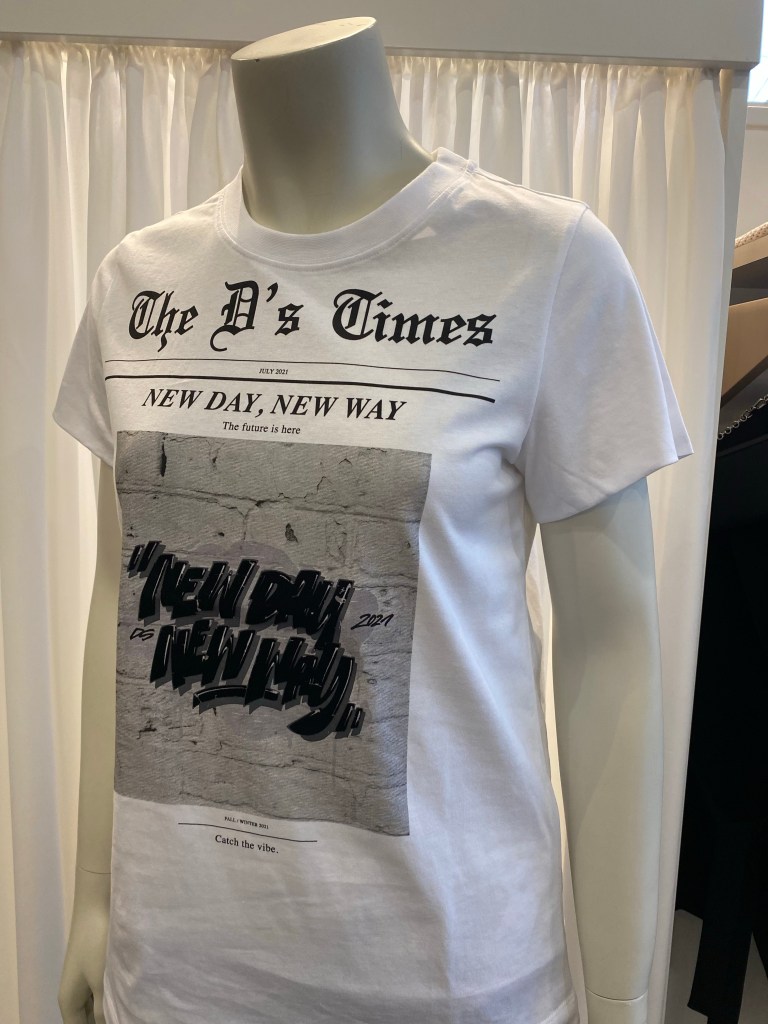 „New day, new way“ jeder Tag bringt neue Möglichkeiten und Wege und jeder Tag bringt neue Chancen. Jede Kollektion von Dorothee Schumacher hat eine eigene Inspiration. Das Motto-Shirt ist aus Baumwolle und der Arm ist doppellagig, damit es besser sitzt.