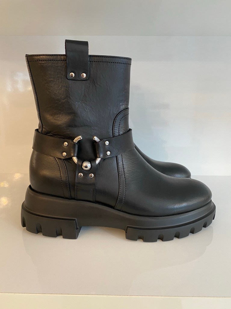 Abrunden kann man diesen außergewöhnlichen Anzug feminin mit klassichen schwarzen spitzen Pumps oder lässig mit Bikerboots, zB dieses Modell von AGL.