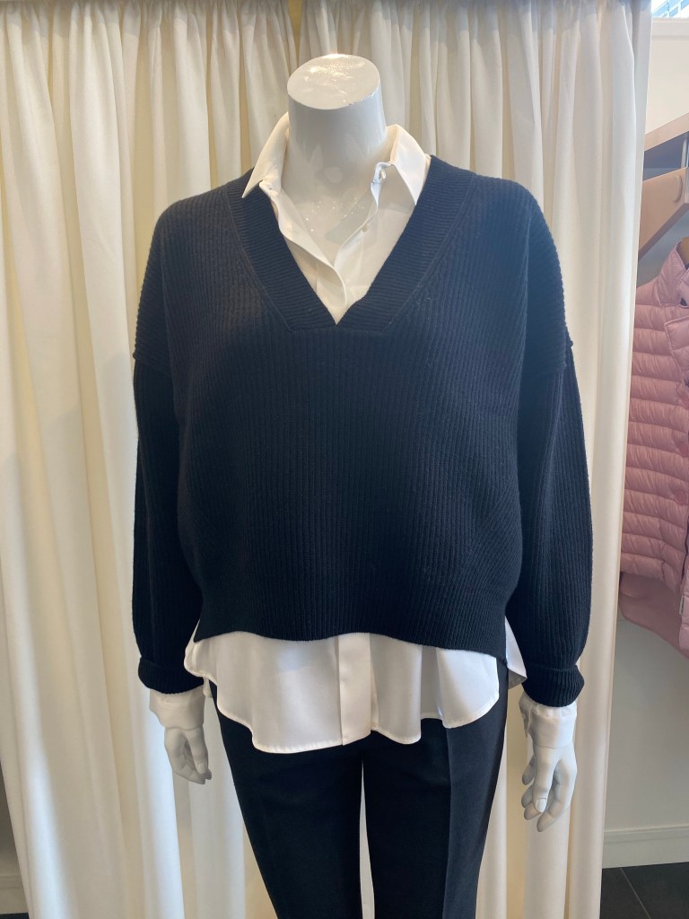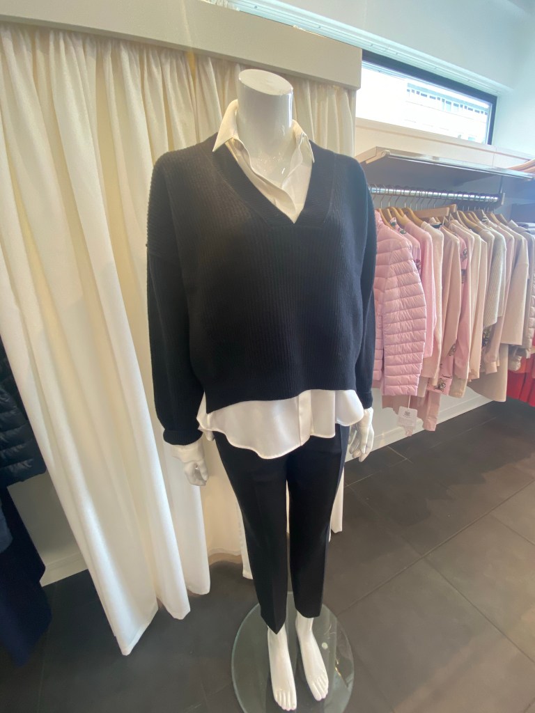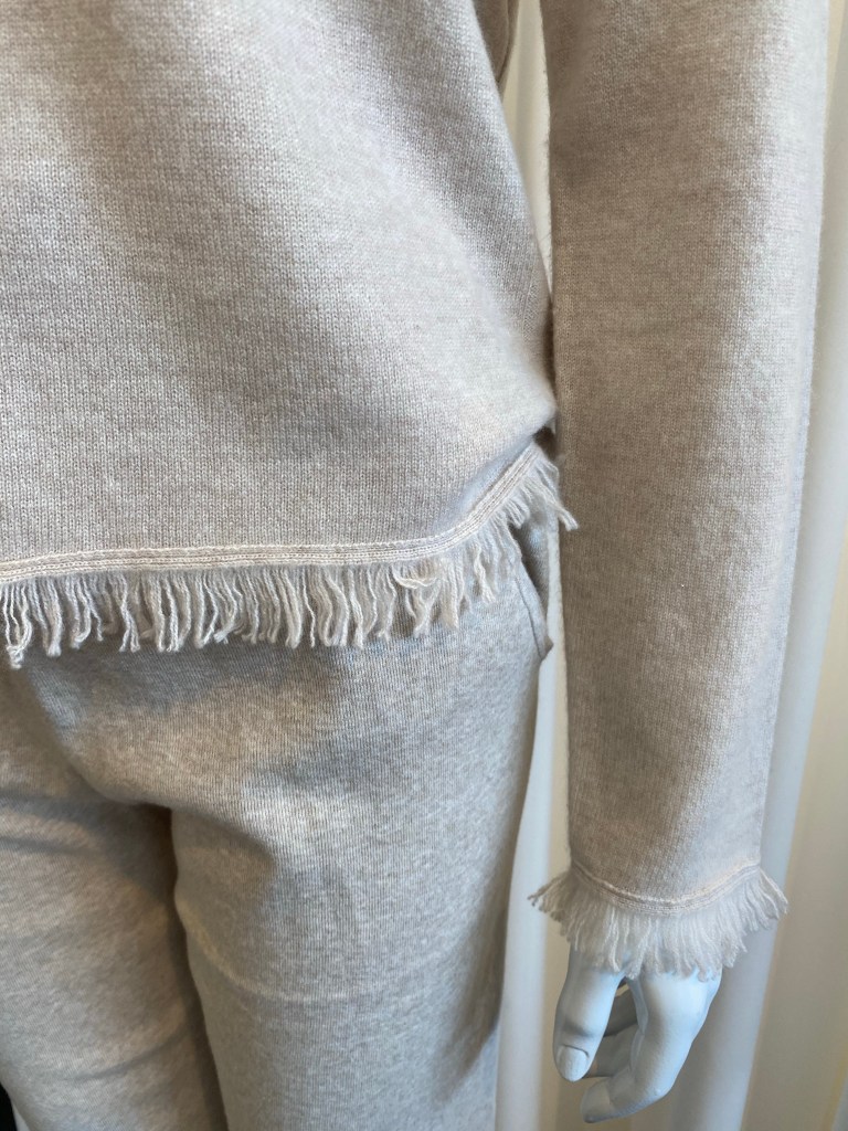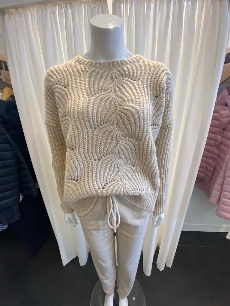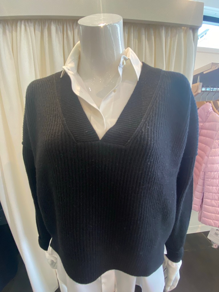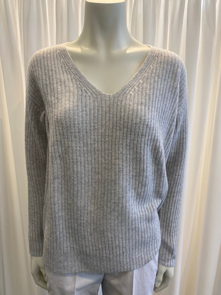 Grauer Strick mit ganz viel weißem Anteil wird zu silber und ist dann gar nicht trist und grau. Dazu dann noch kuschliges Cashmere locker gestrickt mit einem V-Ausschnitt und Sie haben einen zeitlosen Sommerpulli, den Sie vielseitig einsetzen können.