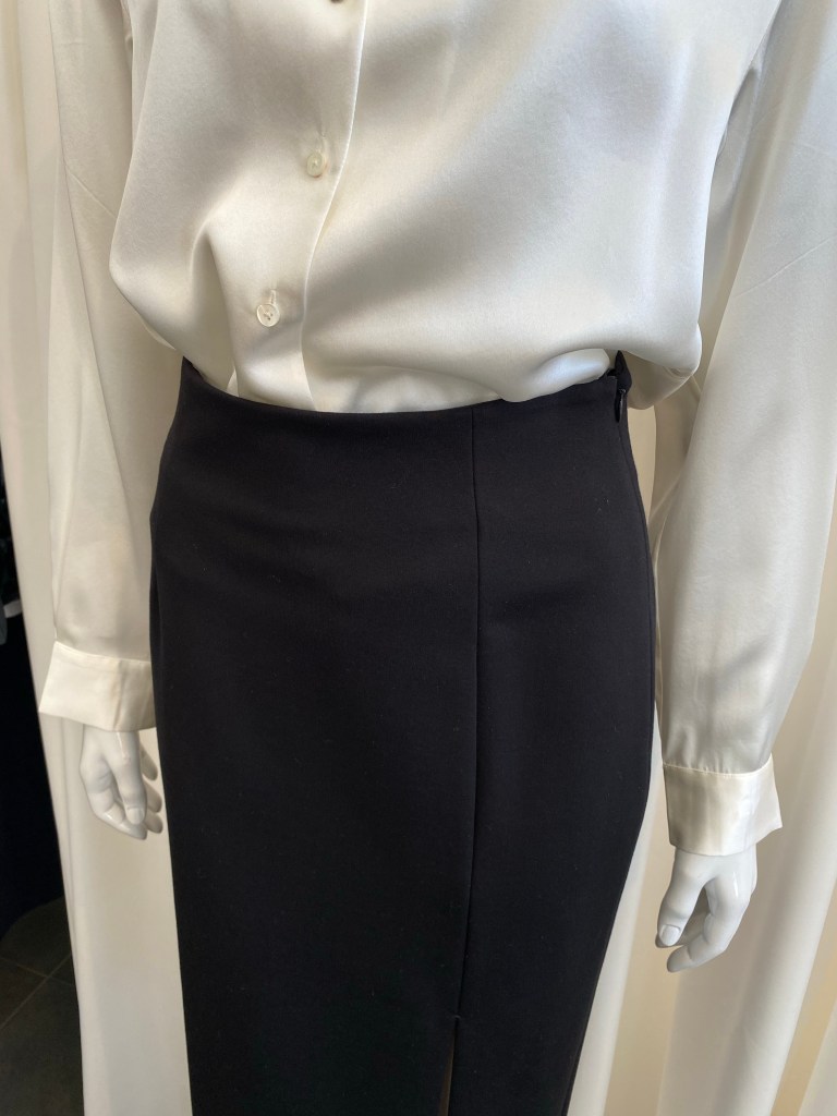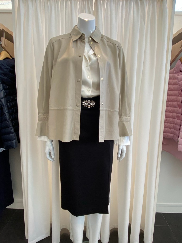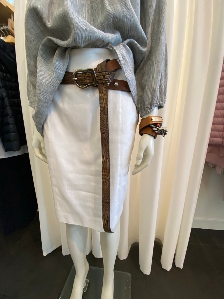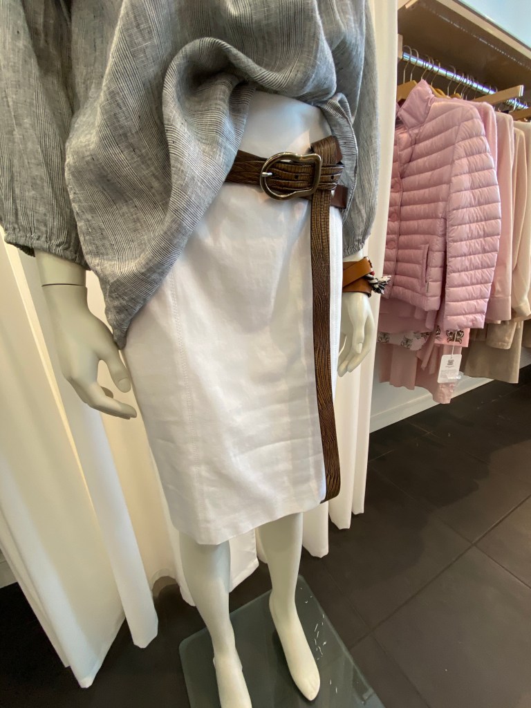 Dazu ein knielanger schmal geschnittener Rock aus Baumwolle mit Elasthan und aufgepeppt mit einem Gürtel.