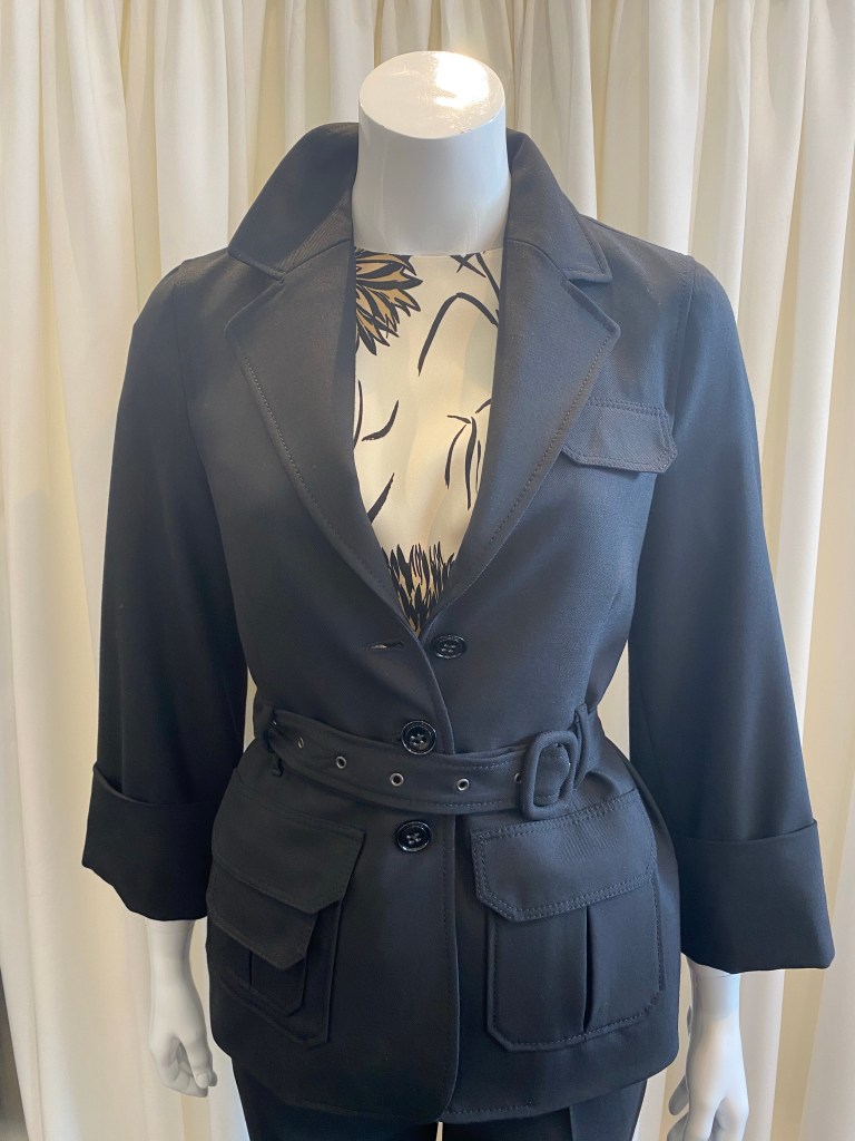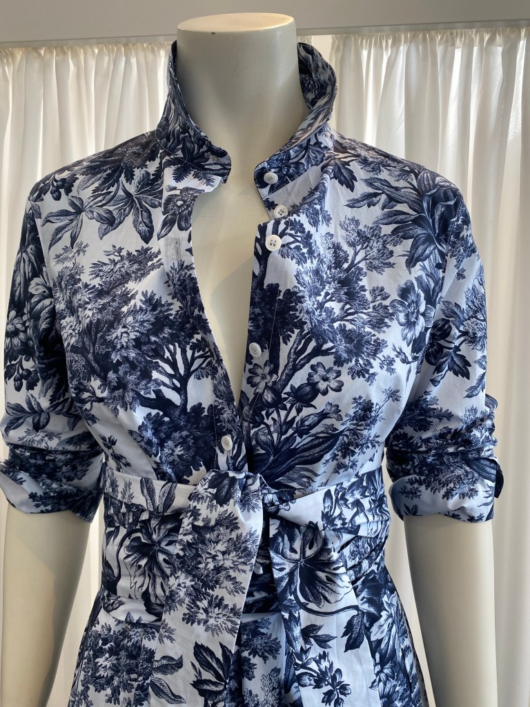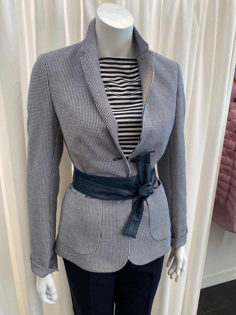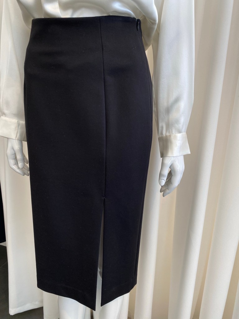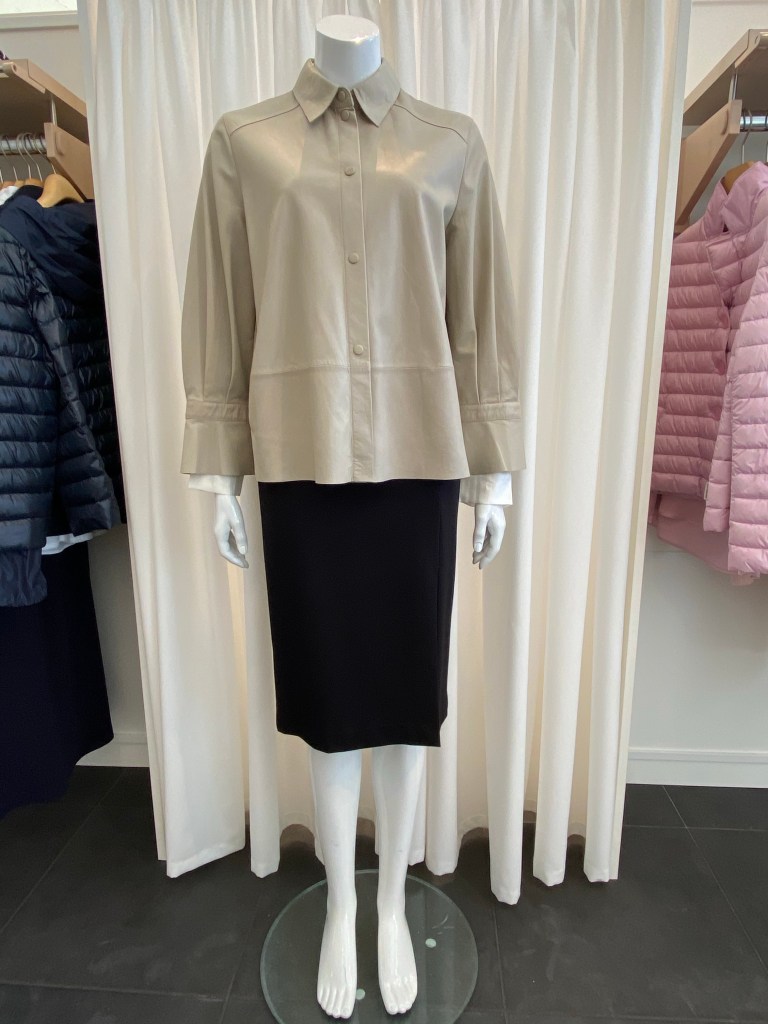 Dazu ein knielanger schmal geschnittener Rock aus Baumwolle mit Elasthan und aufgepeppt mit einem Gürtel.