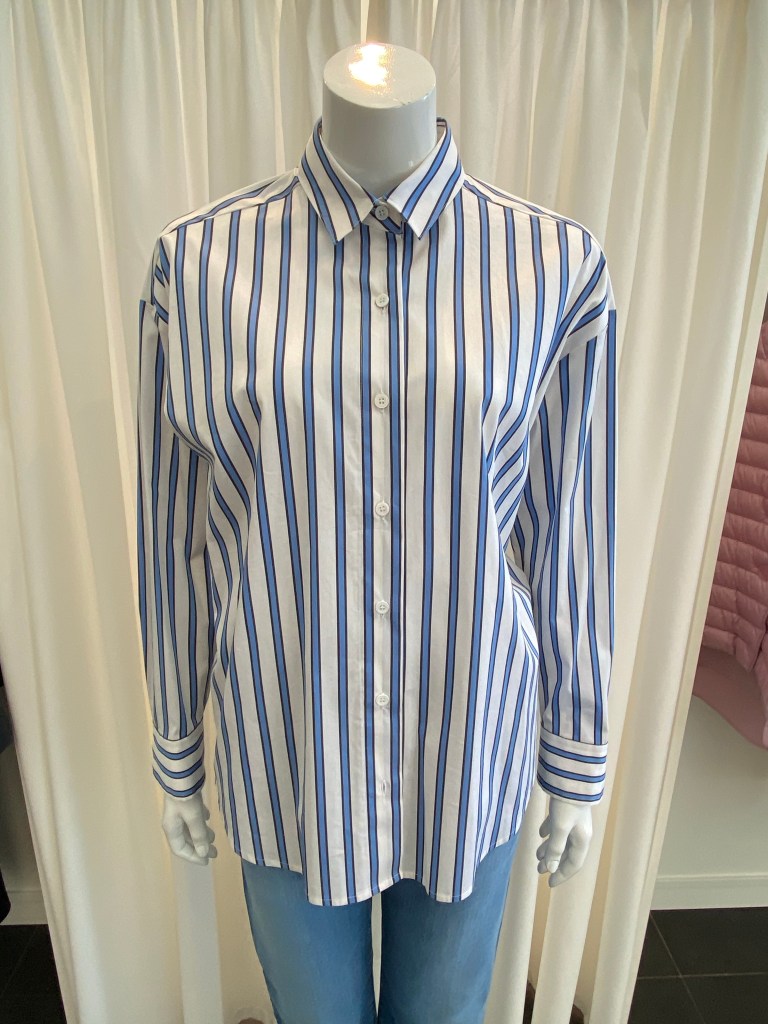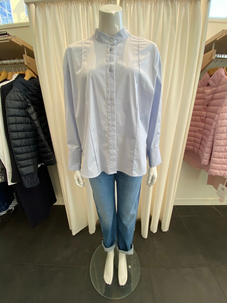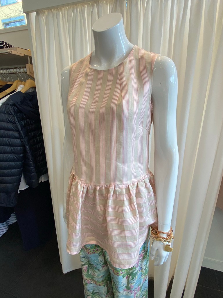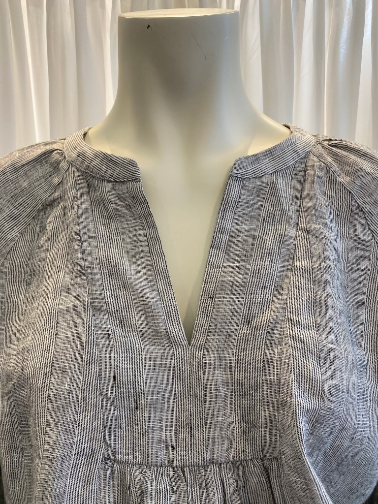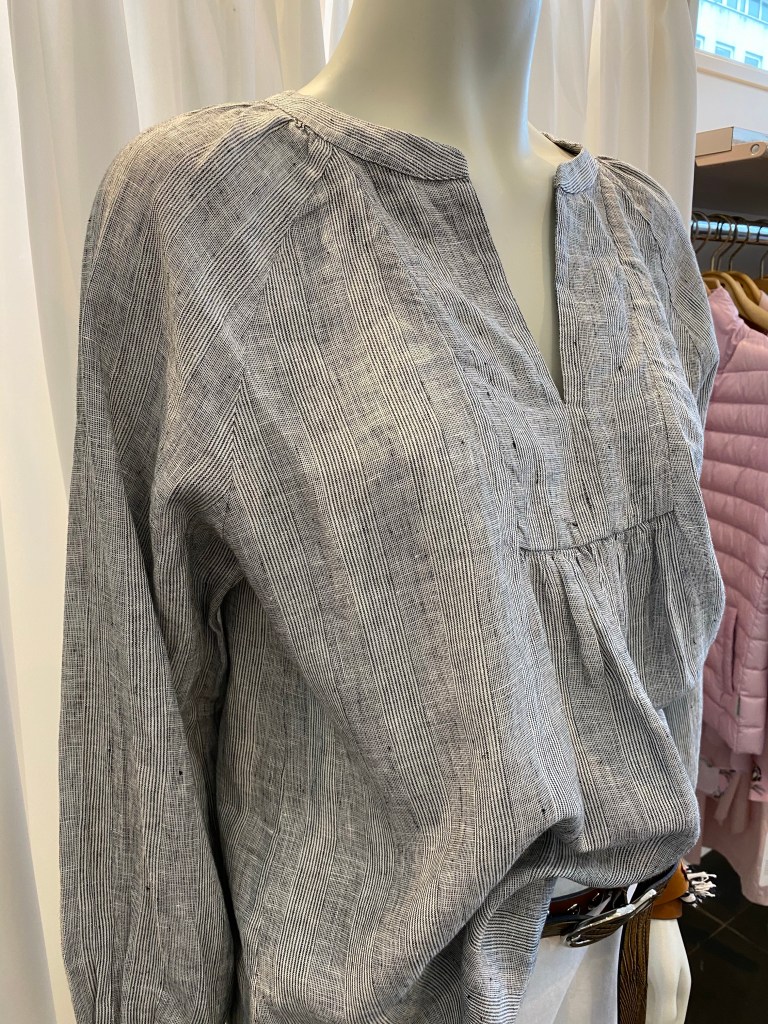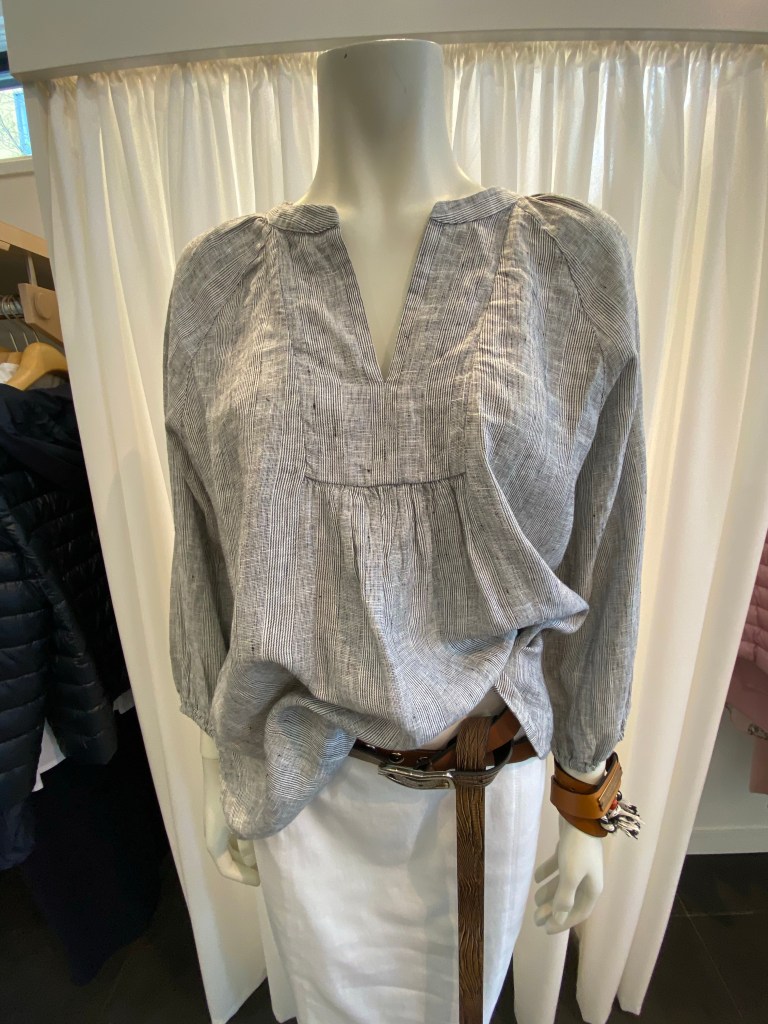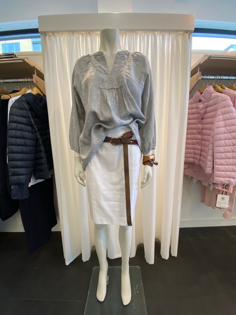 Tunika von Repeat aus reinem Leinen in ganz feinem Glenchek grau mit weiß. Ein bisschen länger als Kleid gibt es auch im Sortiment.