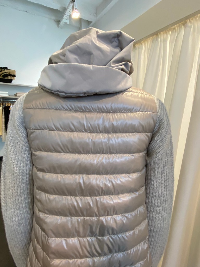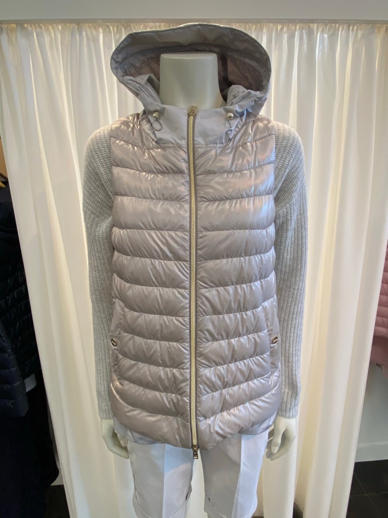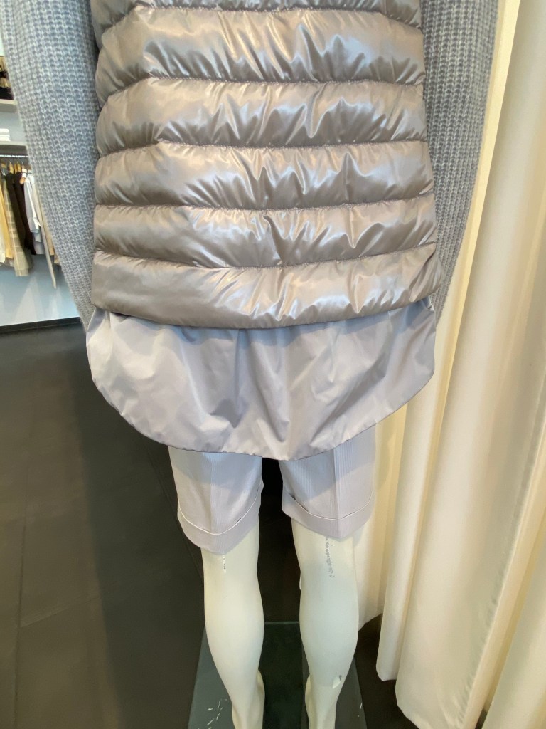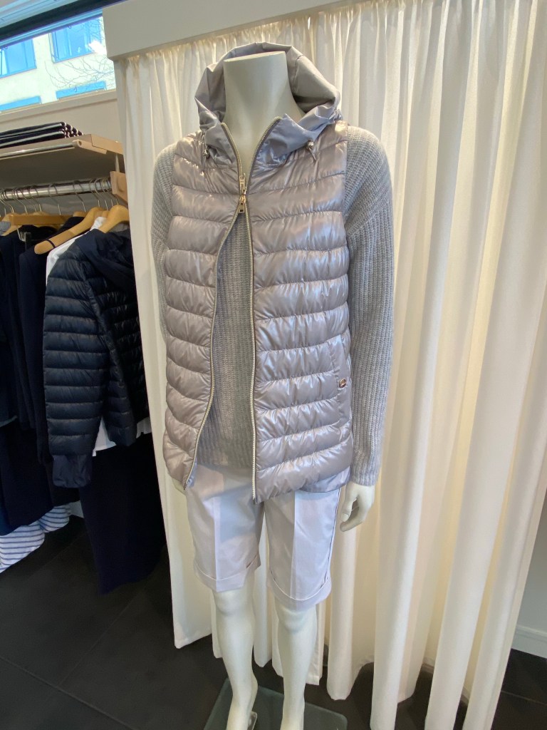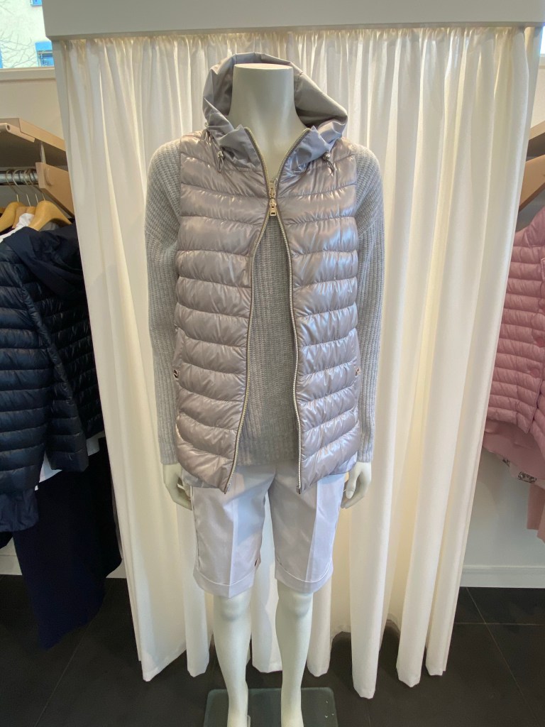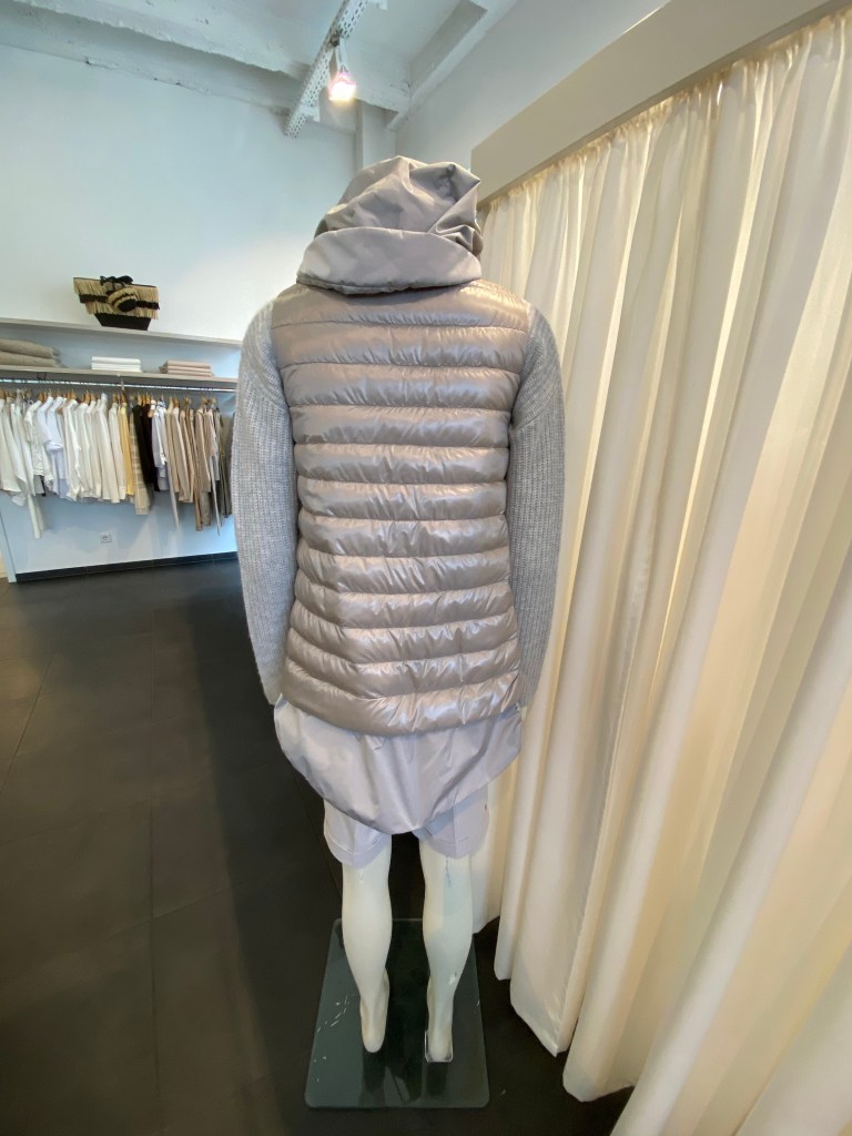Die lange Weste von Herno ist ein toller Begleiter, nicht so dick gefüllt, wärmt sie alle wichtigen Regionen und kann zusammen gefaltet in der Tasche verschwinden. Eine Kapuze schützt vor Wind und ein paar Regentropfen.