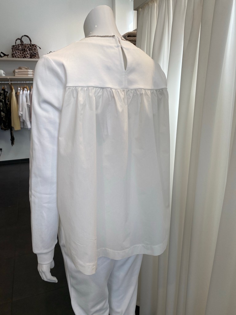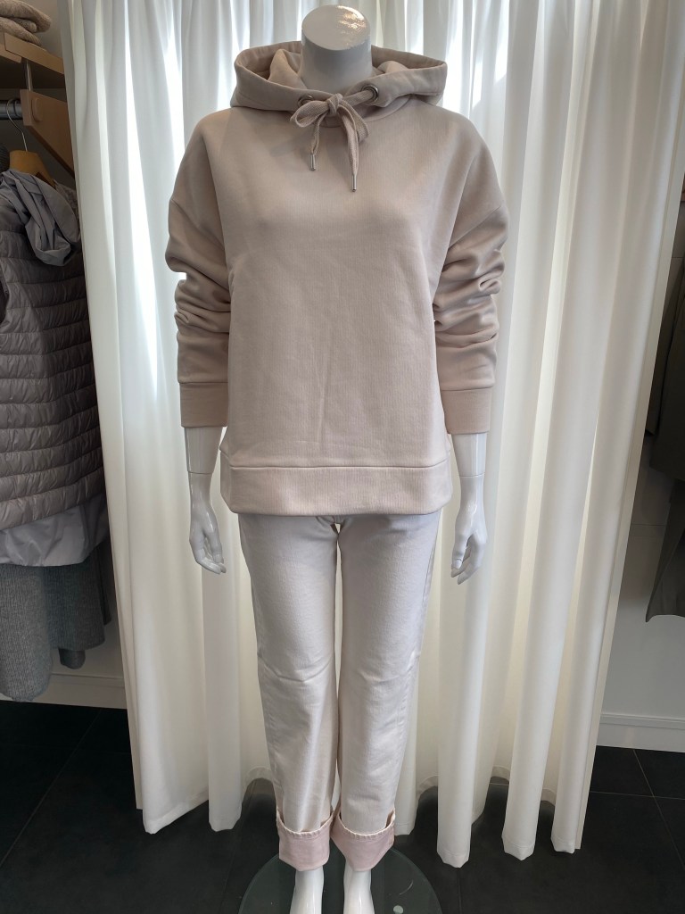 Eine Qualität aus Triacetat, die es bei Windsor seit Jahren gibt und gerade bei Blusen und Kleidern oft zum Einsatz kommt, weil sie einen „schweren“ Fall hat und unkompliziert in der Pflege ist, begeistert uns auch immer wieder. Diese Bluse hat einen 3/4 langen Fledermaus-Arm und hat den gleichen Farbton wie Hose und Jacke.